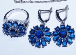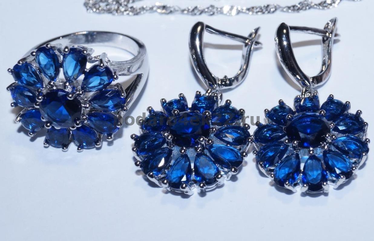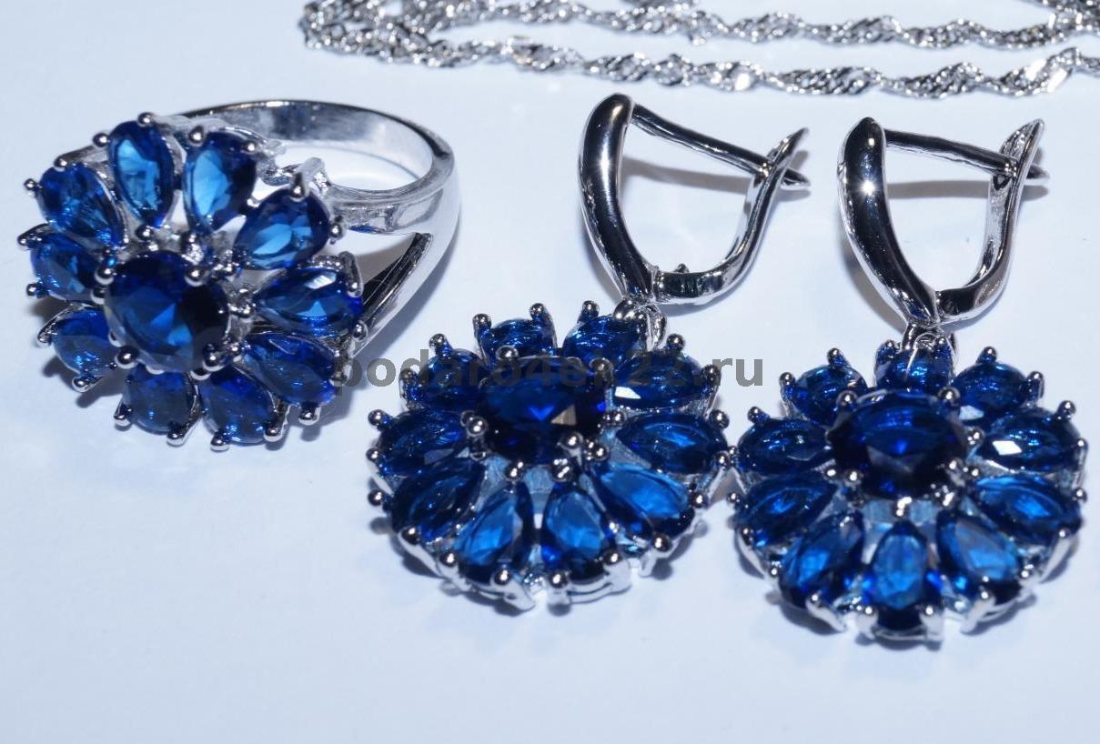 Комплект, серьги и кольцо с искусственными сапфирами. Длина серёжек 3,5 см. Размер кольца 19. Камни 7 мм. Посеребрение (практически одно серебро) с родиевым покрытием, проба 925. Хорошее качество. Производство Россия.