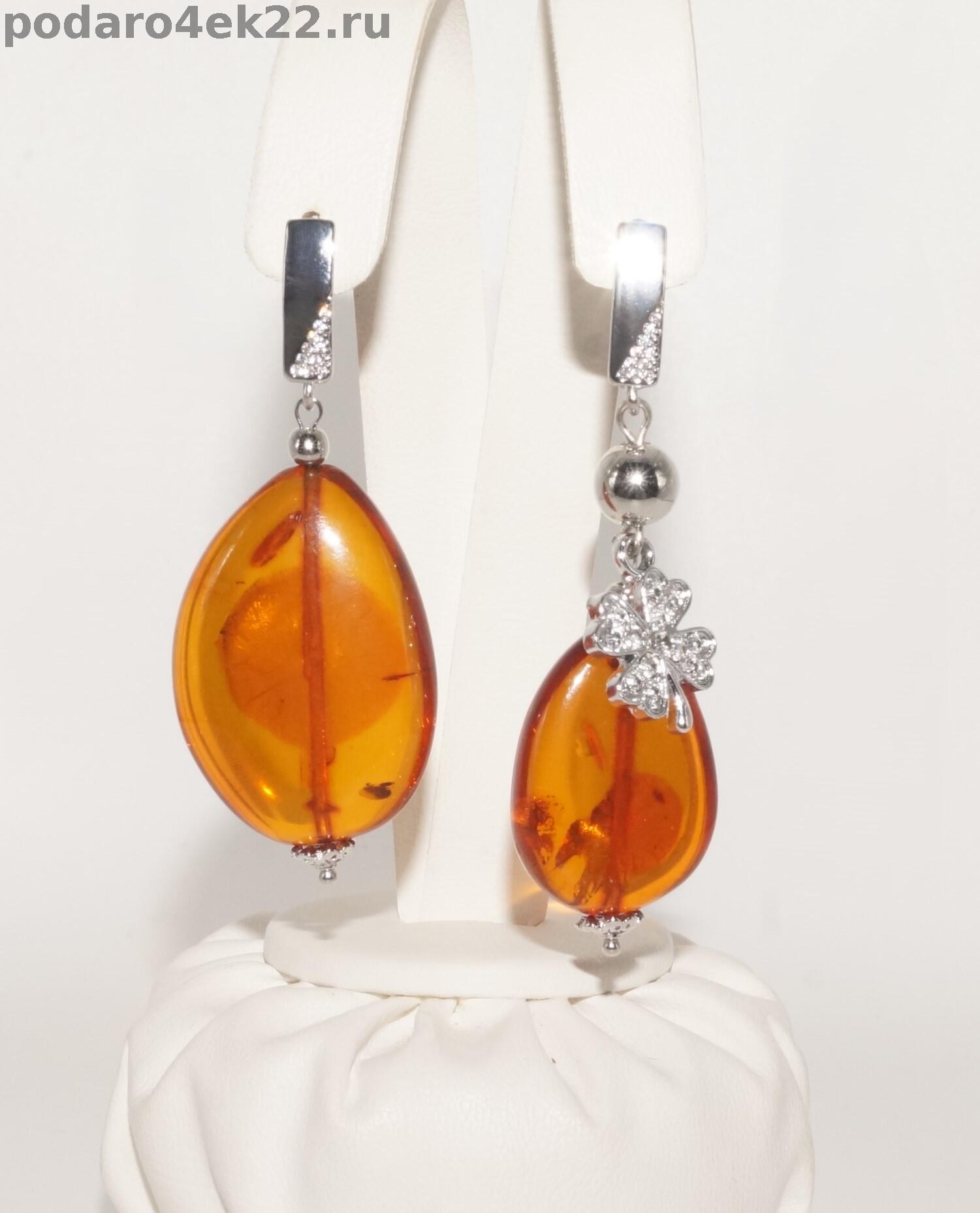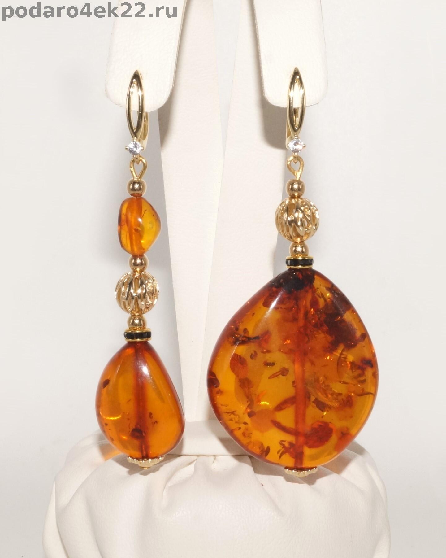 Авт-014. Крупные ассиметричные серьги "На удачу" с янтарем.