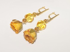 Авт-016. Длинные серьги "Розы с янтарем, хризолитами и розами.