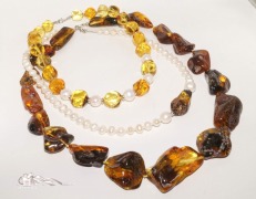 Авт-004. Трехрядное колье - трансформер из жемчуга и янтаря.