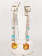 Авт-021. Длинные серьги - цепочки Кубики из янтаря и бирюзы.