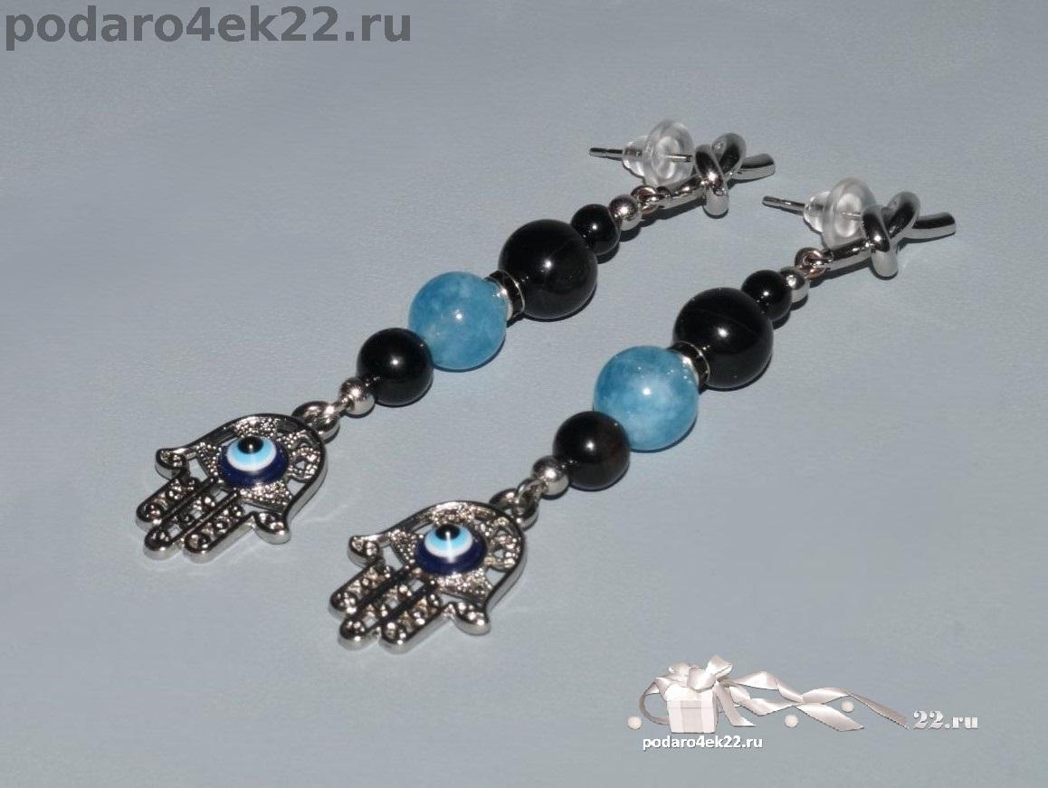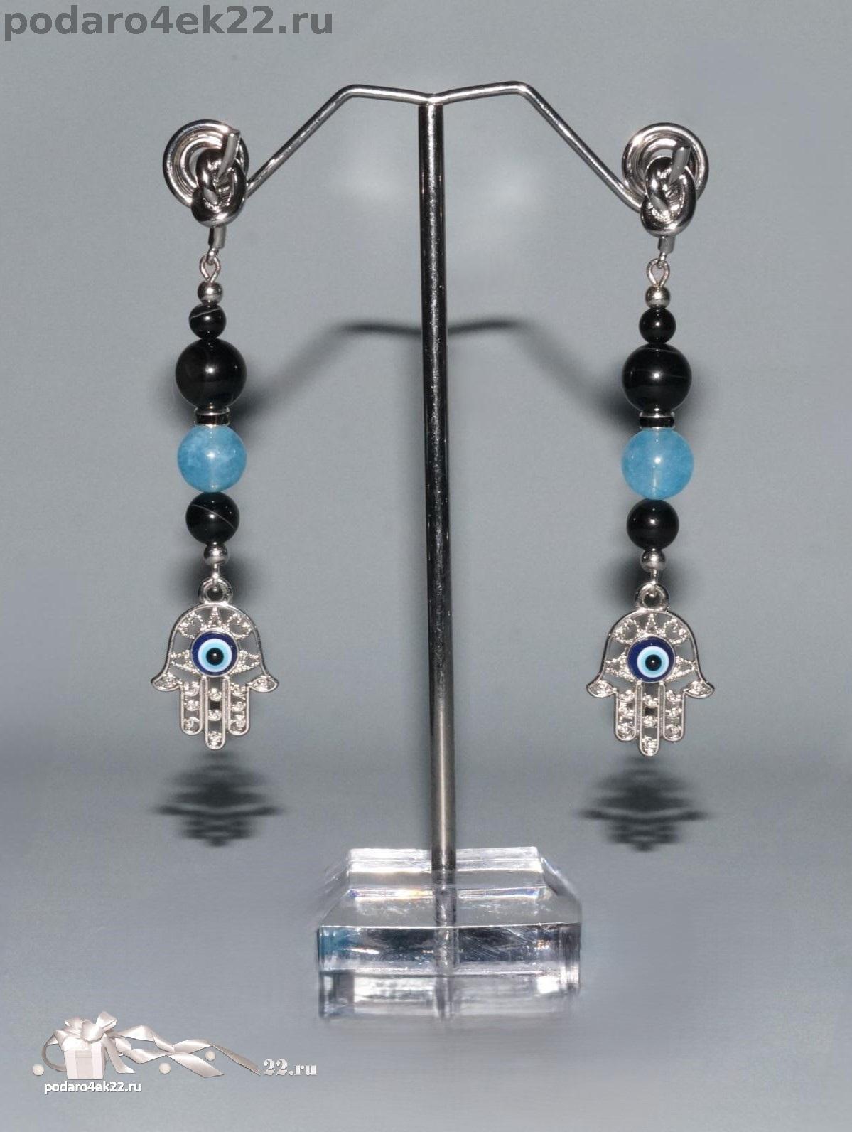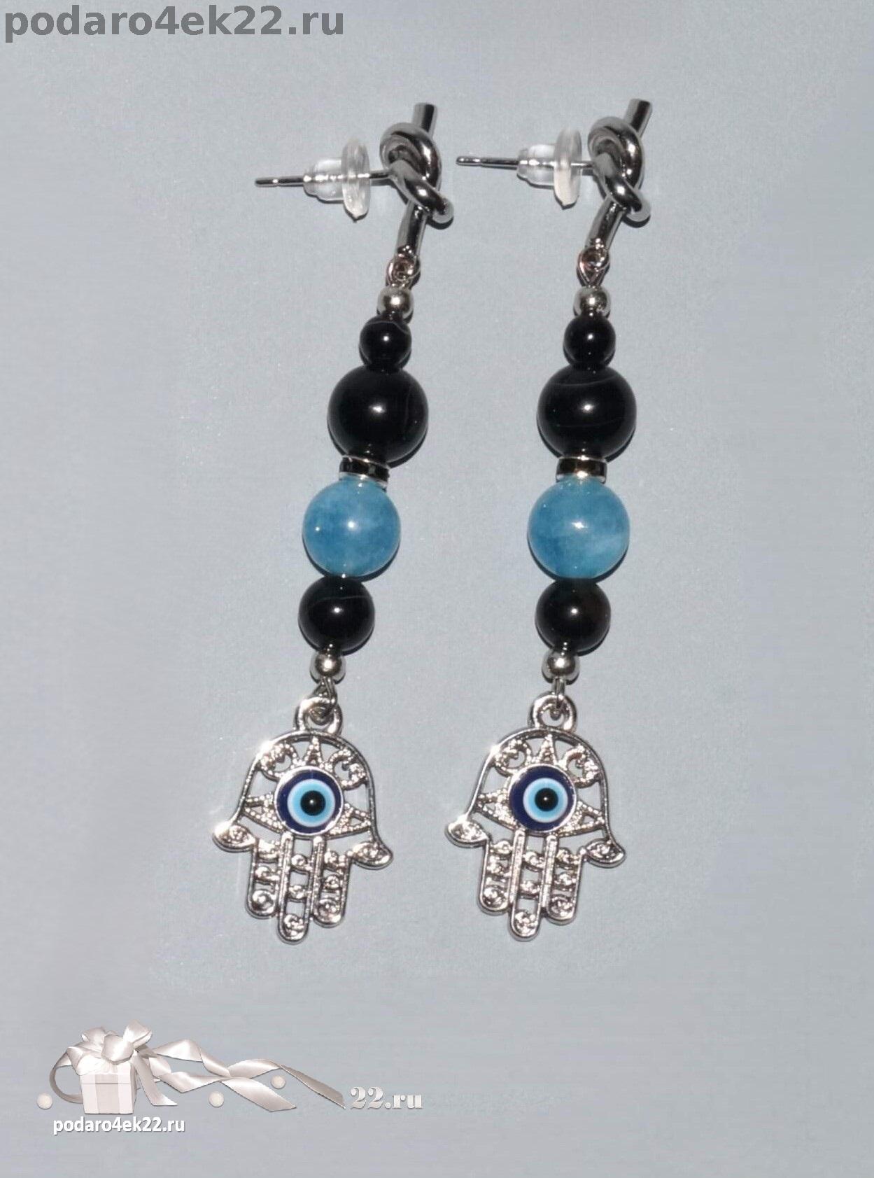 Серьги "Рука Хамса" с натуральными черным агатом и аквамарином. Длина сережек 7,3 см. Размер камней от 4 до 8 мм. Фурнитура родированная.