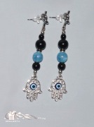 Авт-039. Серьги "Рука Хамса" с черным агатом и аквамарином.