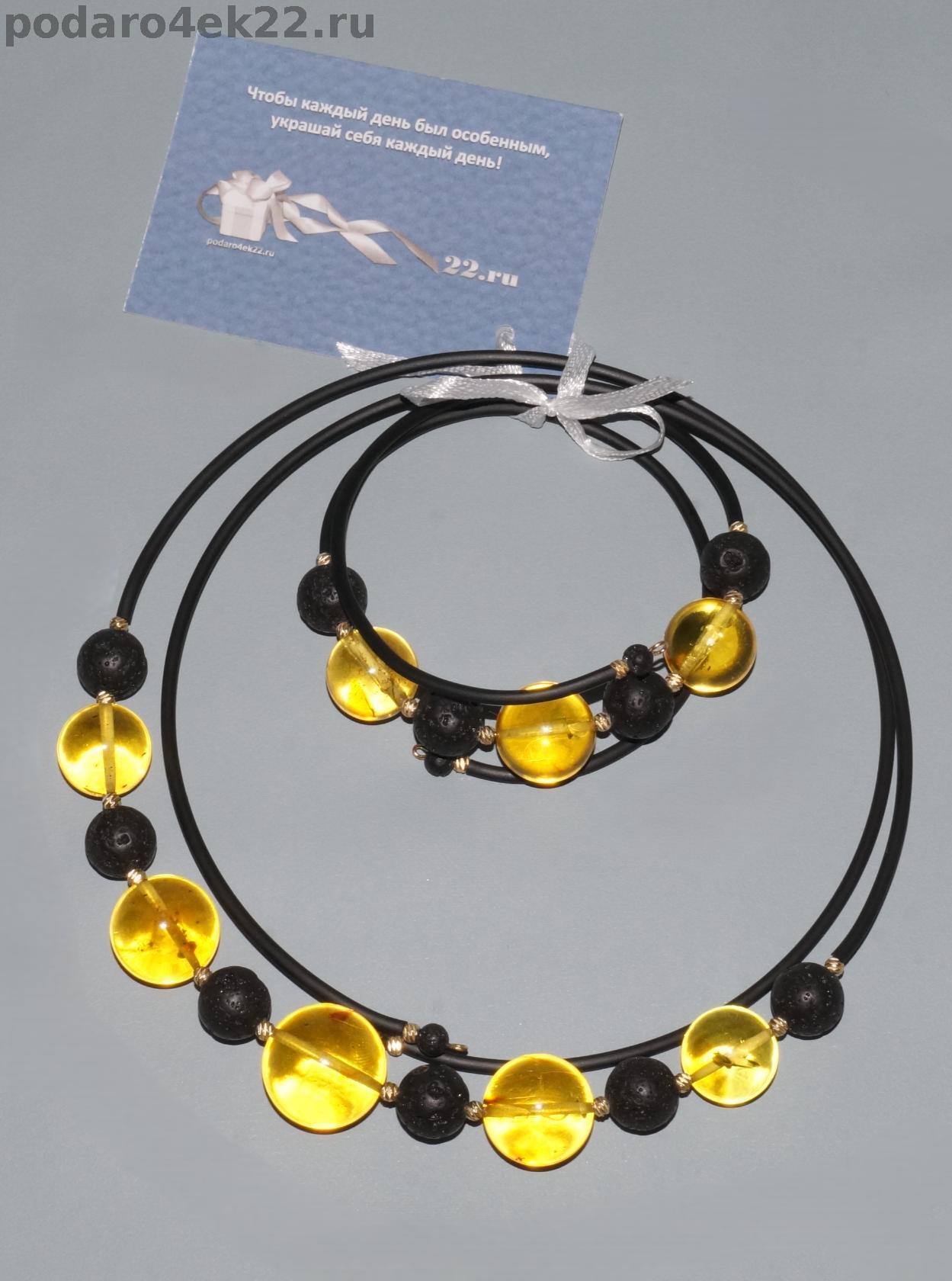 Авторский комплект «Огненные орбиты». Колье и браслет из шариков натурального янтаря и вулканической лавы на проволоке мемори с каучуковым шнуром. Длина регулируется. Размер шариков: янтарь 1,3 - 1,7 см, лава 1 см. Янтарь цельный природный балтийский с включениями (кора и мох, возраст которых около 40 млн лет). Ручная работа.