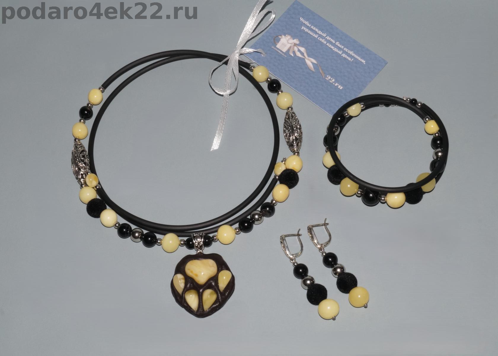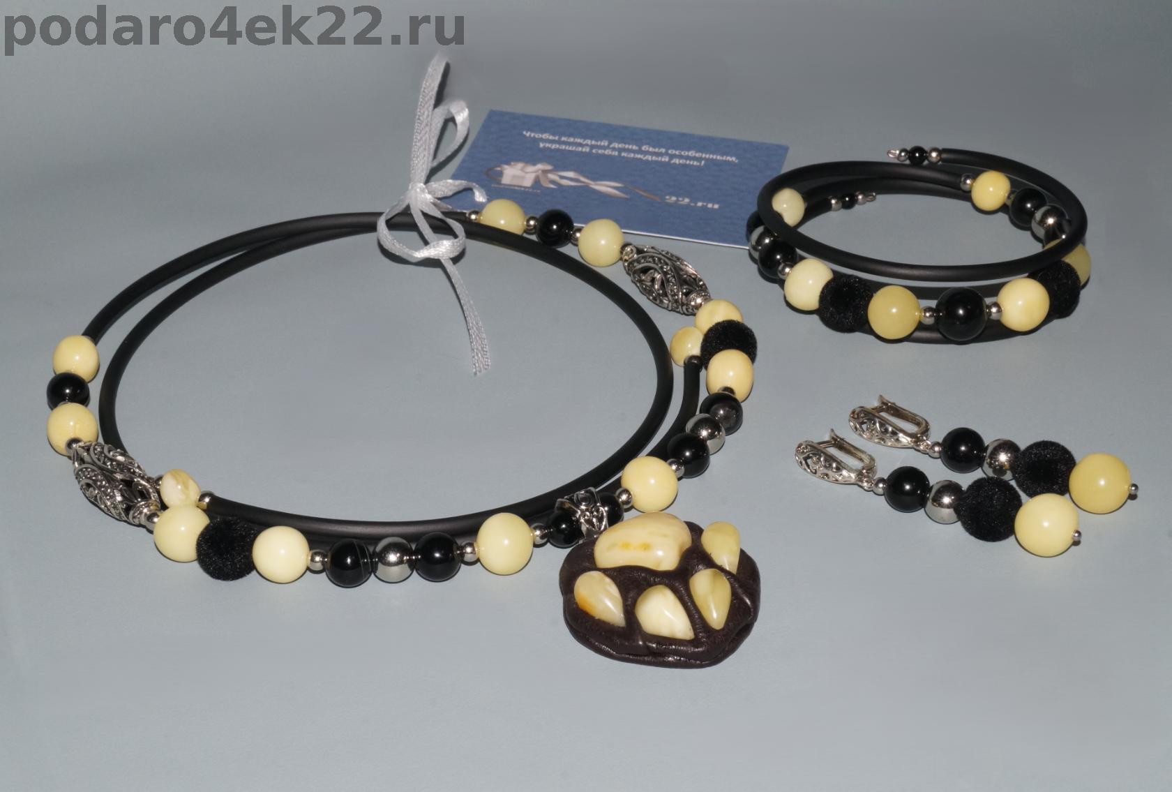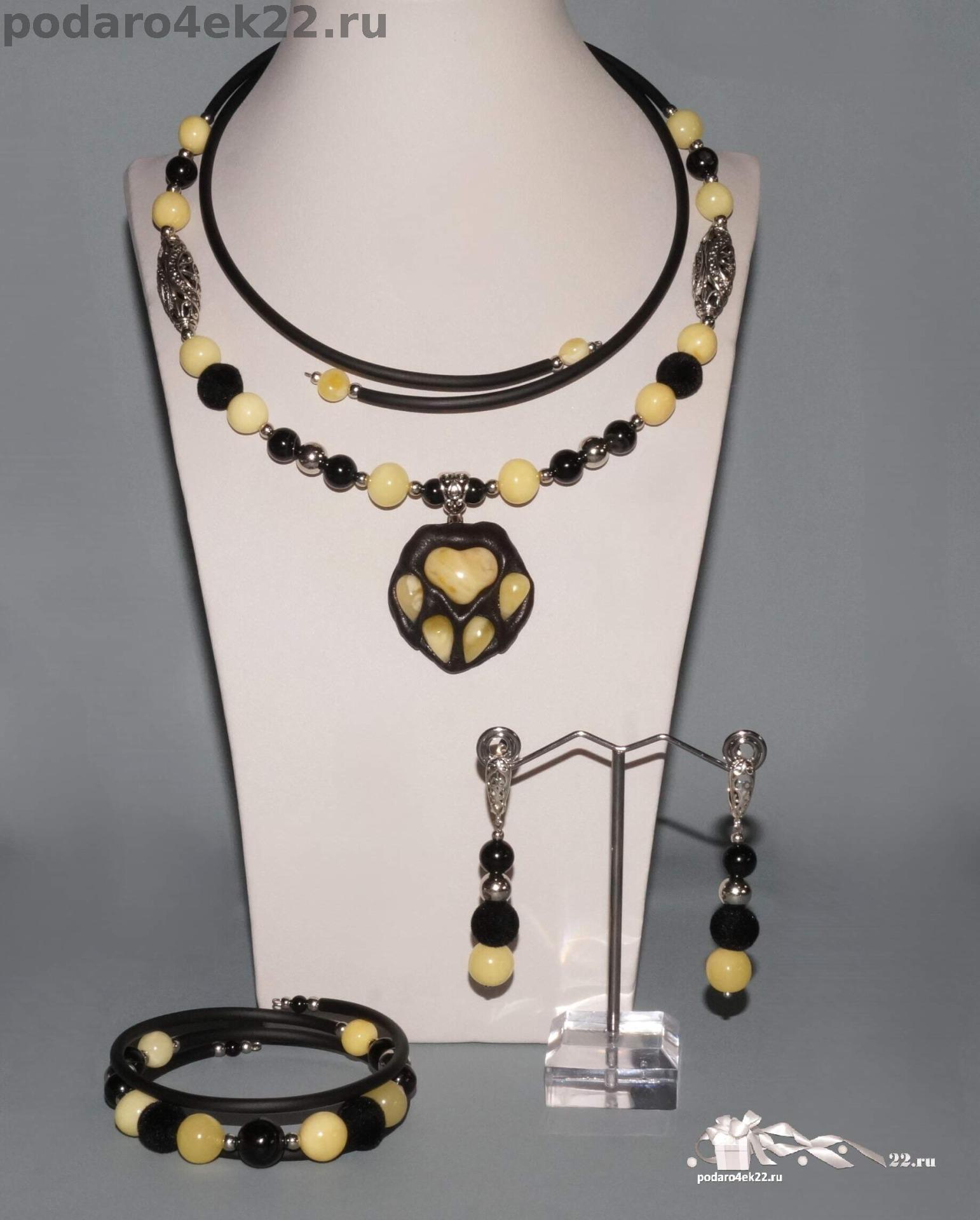 Авторский комплект ручной работы «Царица зверей». Колье, браслет и серьги с натуральным белым королевским пейзажным янтарем, черным агатом, бархатными шариками и подвеской лапкой из натуральной кожи. Колье и браслет на проволоке мемори с каучуковым шнуром, длина регулируется. Длина сережек 5,7 см. Размер камней 0,7 - 1,7 см. Янтарь цельный природный балтийский, отборный, без включений и ямочек, не гретый, не плавленный.