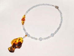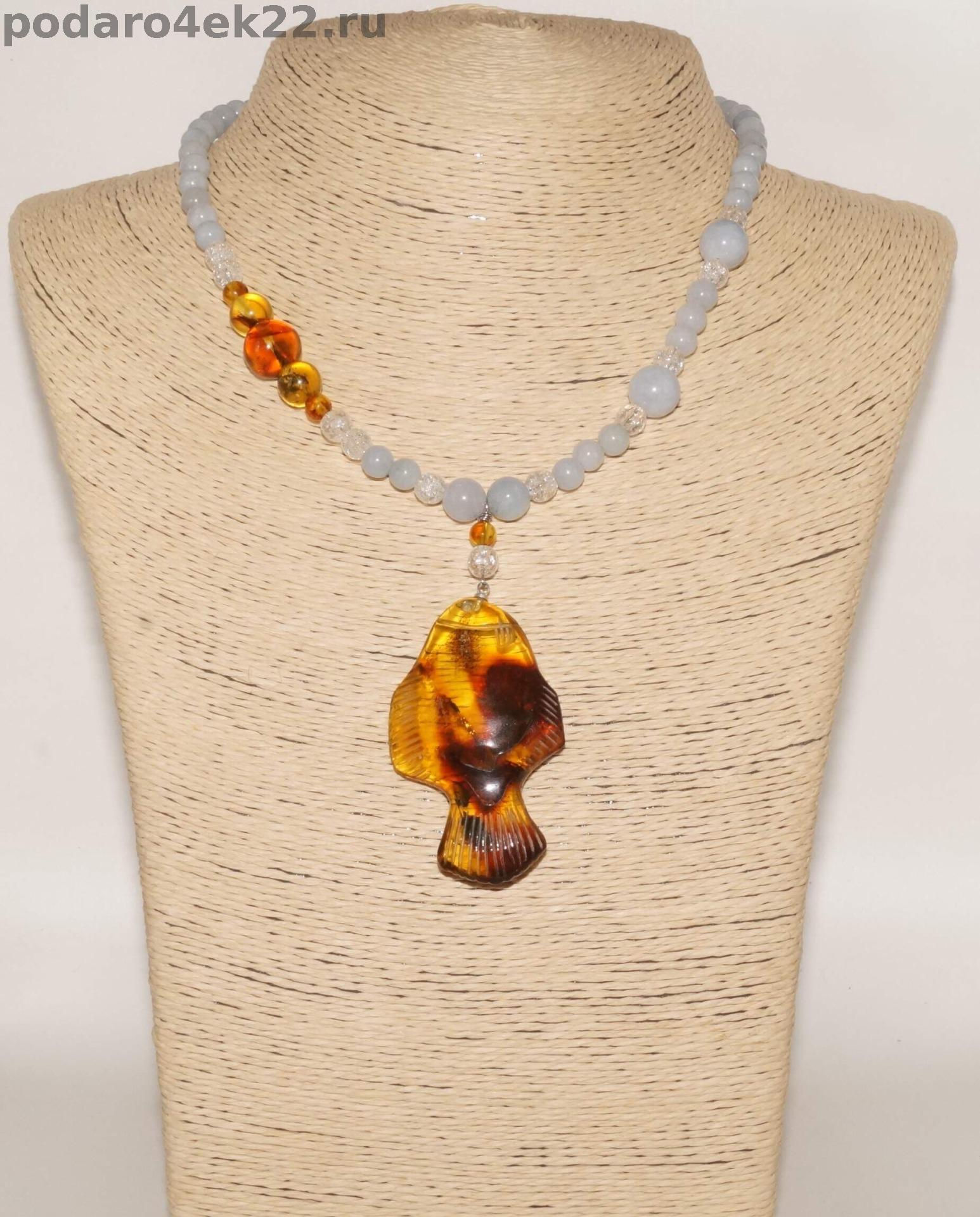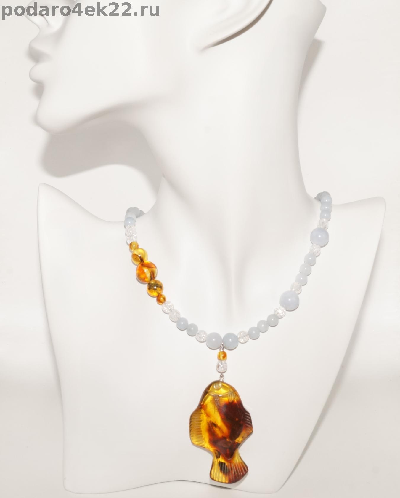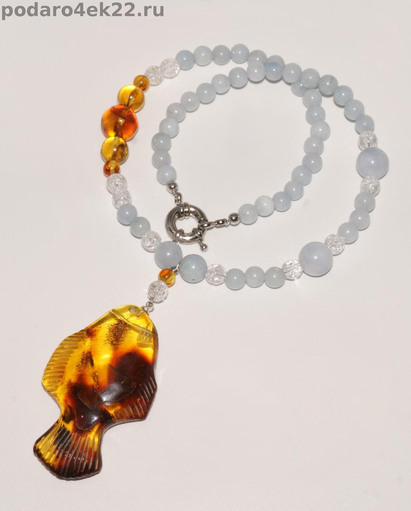 н-0001. Чокер "Балтийское море" из аквамарина, янтаря и кварца с кулоном рыбкой.