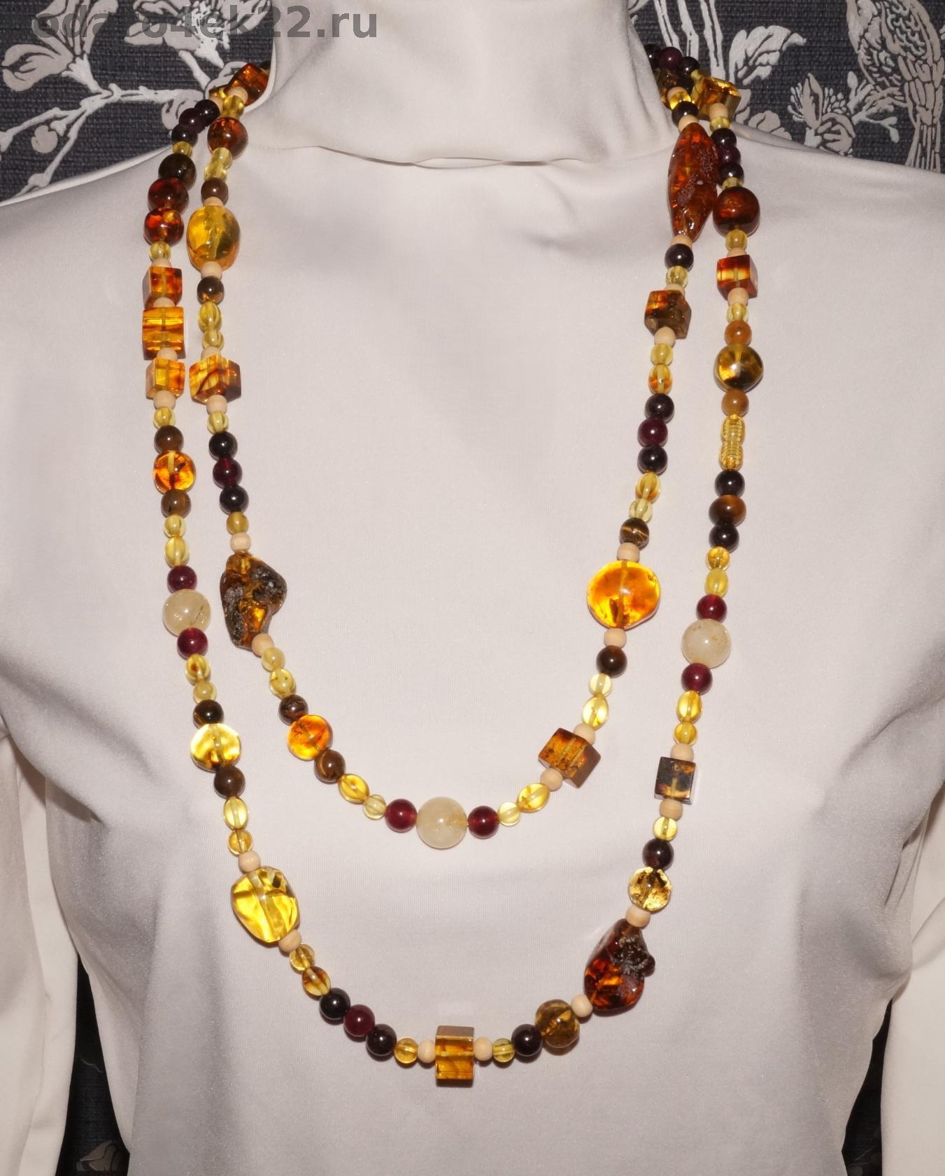Длинные бусы, колье - сотуар из натуральных камней: янтарь (природной формы, оливки, шарики и кубики), цитрин, гранат, тигровый глаз и деревянные бусины. Длина бус 164 см. Вес 140,4 гр. Ручная авторская работа. В подарочной деревянной шкатулке.