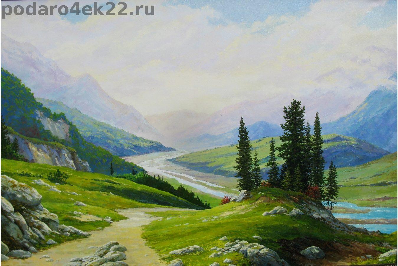 Картина "Горная долина". Холст, масло. Размер в наличии 80 х 120 см. Пейзаж с натуры. Картины без рамки, по просьбе большинства покупателей, так как в основном все рамы подбирают самостоятельно, под свой интерьер. Возможна продажа с рамкой, по договоренности. Другой размер возможен - обсудим. Известный художник Алтайского края Брынькин Алексей Николаевич.