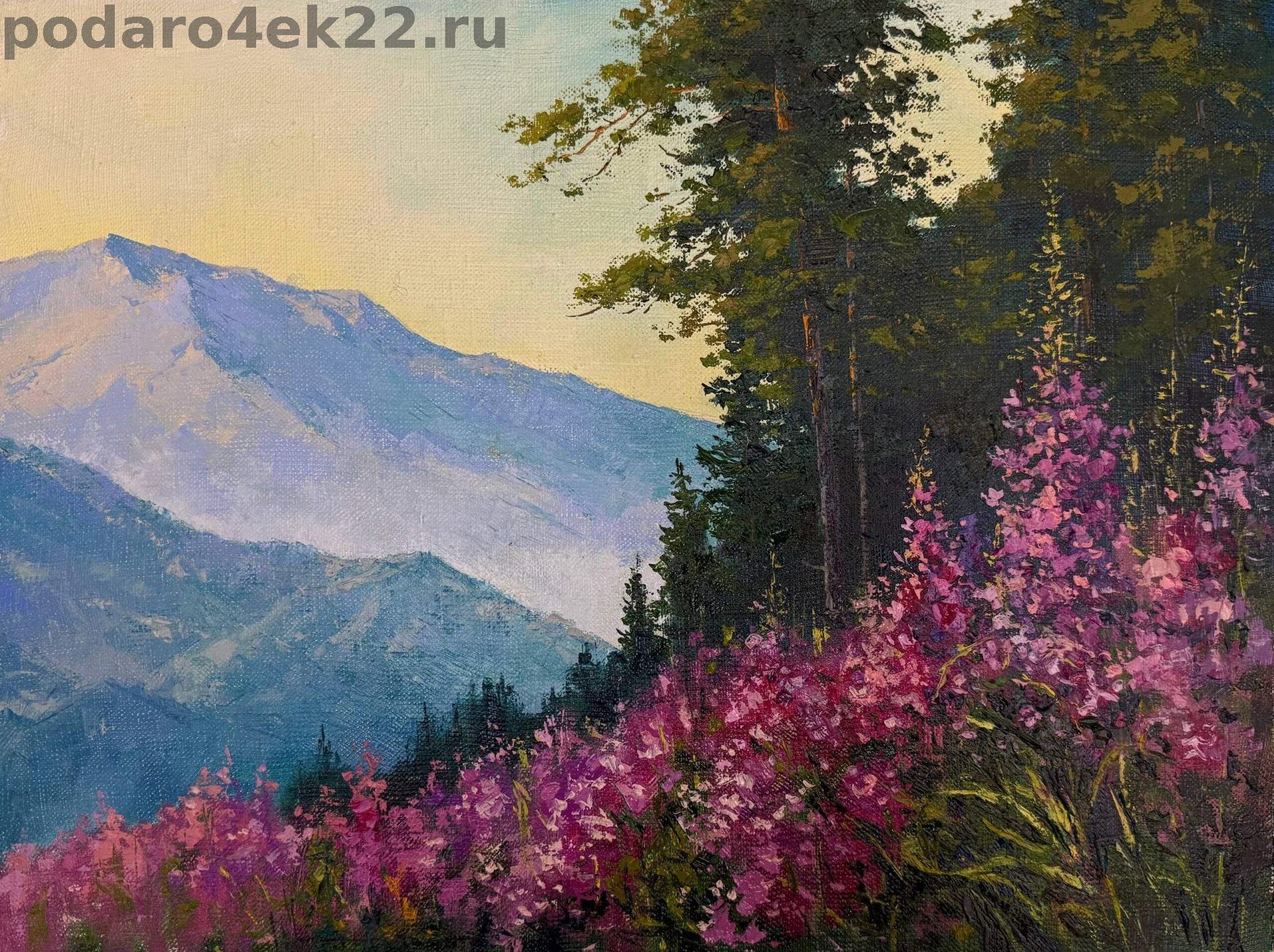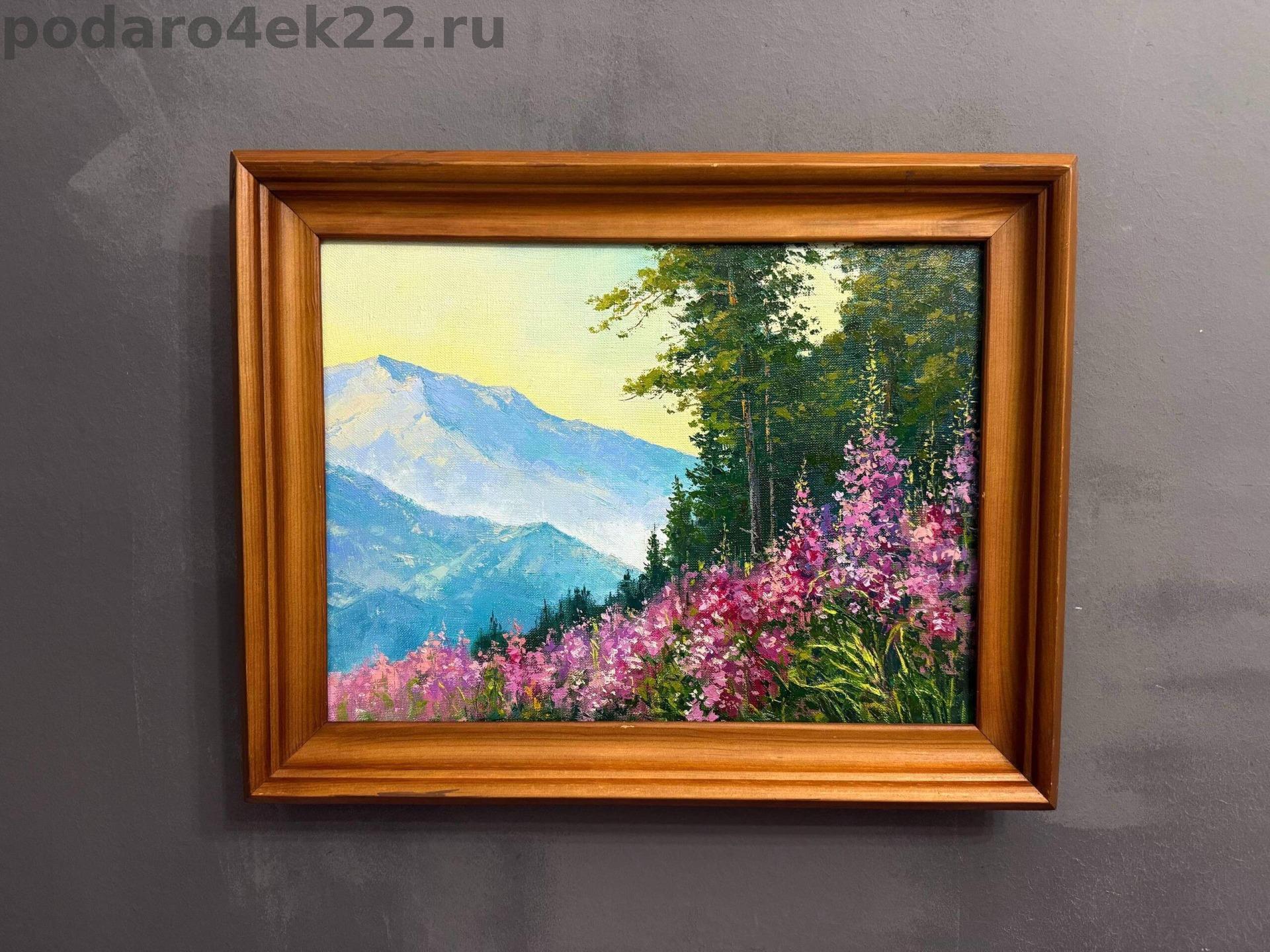 Картина "Алтайский пейзаж". Холст, масло. Размер 40 х 30 см. Пейзаж с натуры. На переднем плане поле с лекарственным растением Иван-чаем. Картины без рамки, по просьбе большинства покупателей, так как в основном все рамы подбирают самостоятельно, под свой интерьер. Возможна продажа с рамкой, по договоренности. Другой размер возможен - обсудим. Известный художник Алтайского края Брынькин Алексей Николаевич.