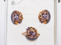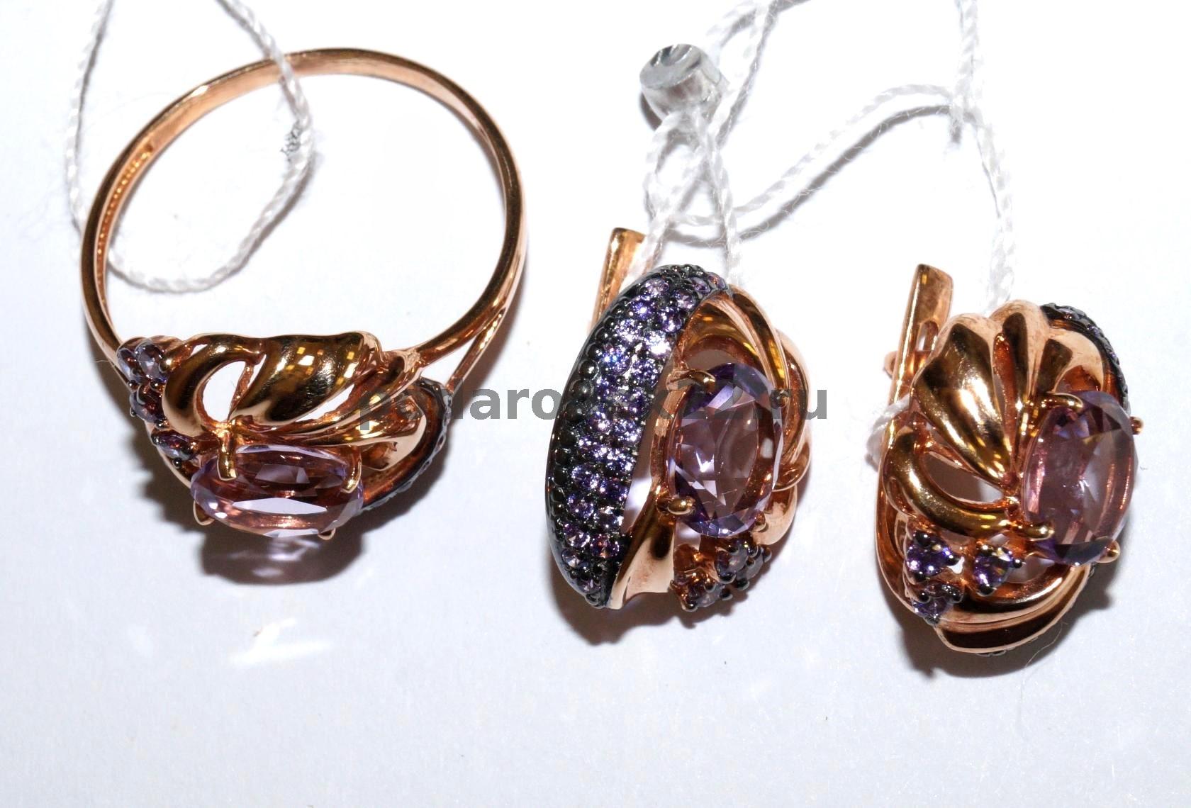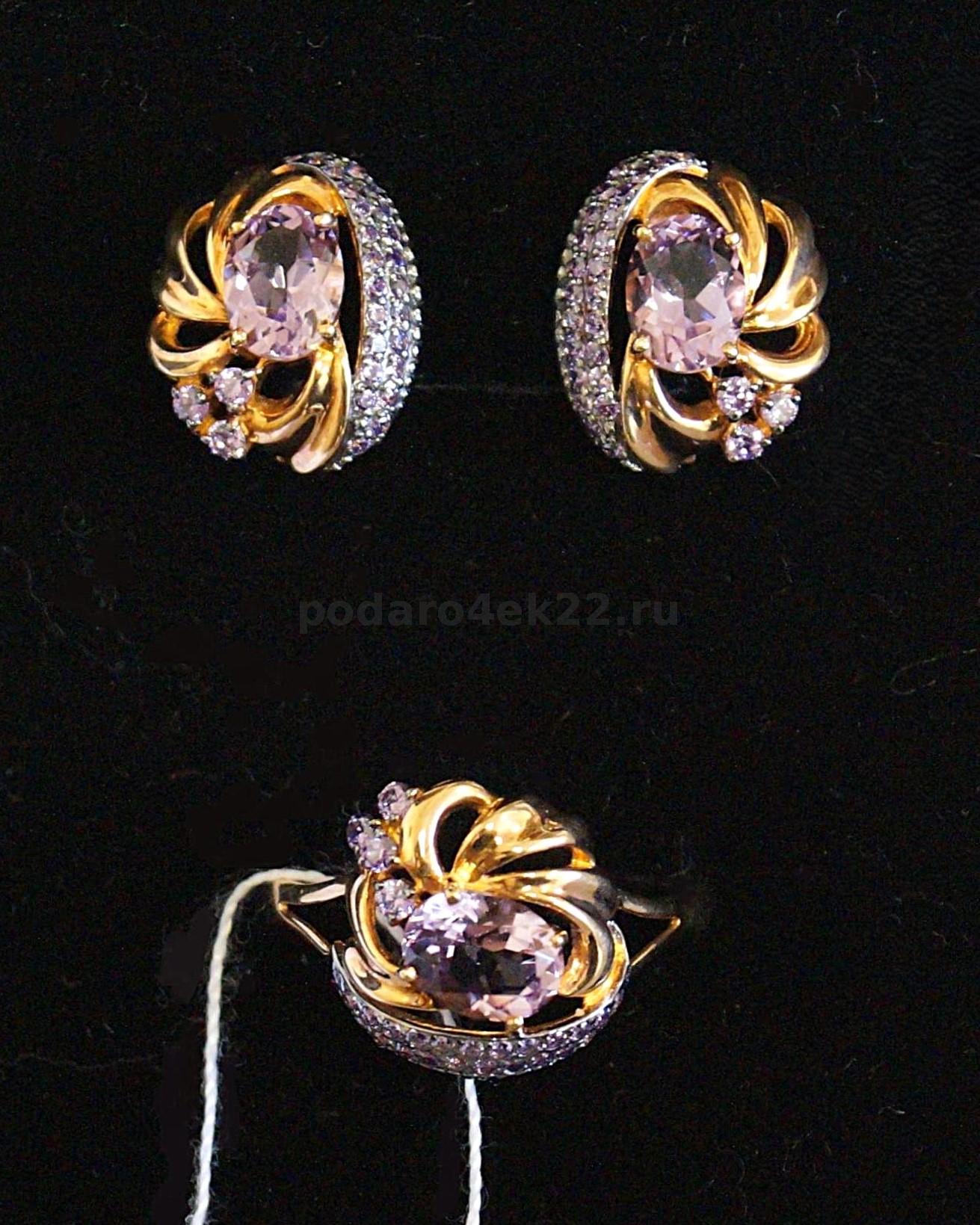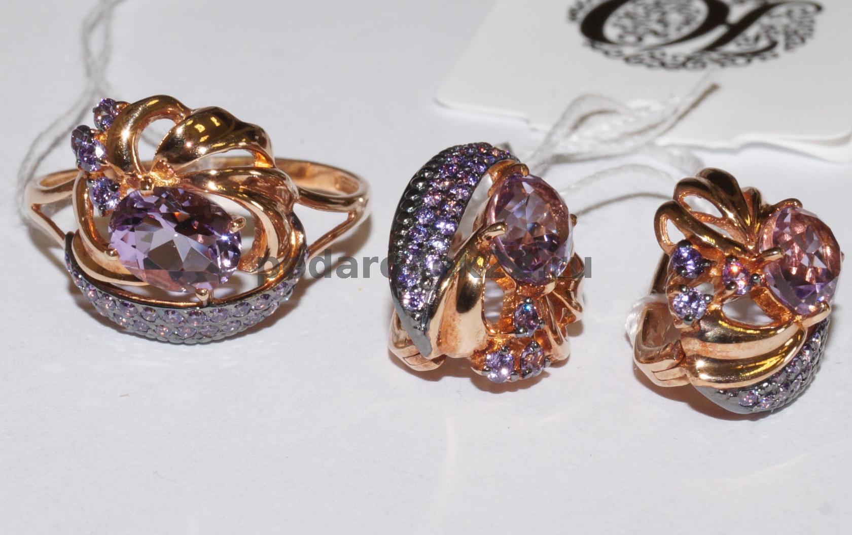 Серьги и кольцо с натуральными аметистами и фианитами в позолоте (серебро 925 пробы, с покрытием розового золота 585 пробы). Длина серёжек 1,7 см. Кольцо 20,5 размера. Камни 6 х 9 мм. Производство Россия. По 2 пробы, пломбы, бирки. Хорошее качество.