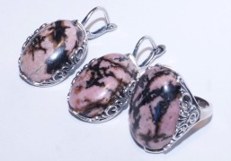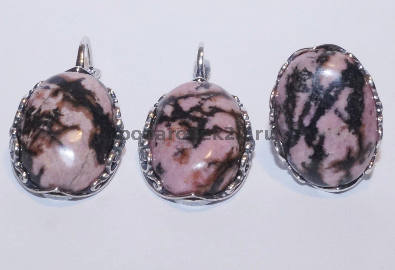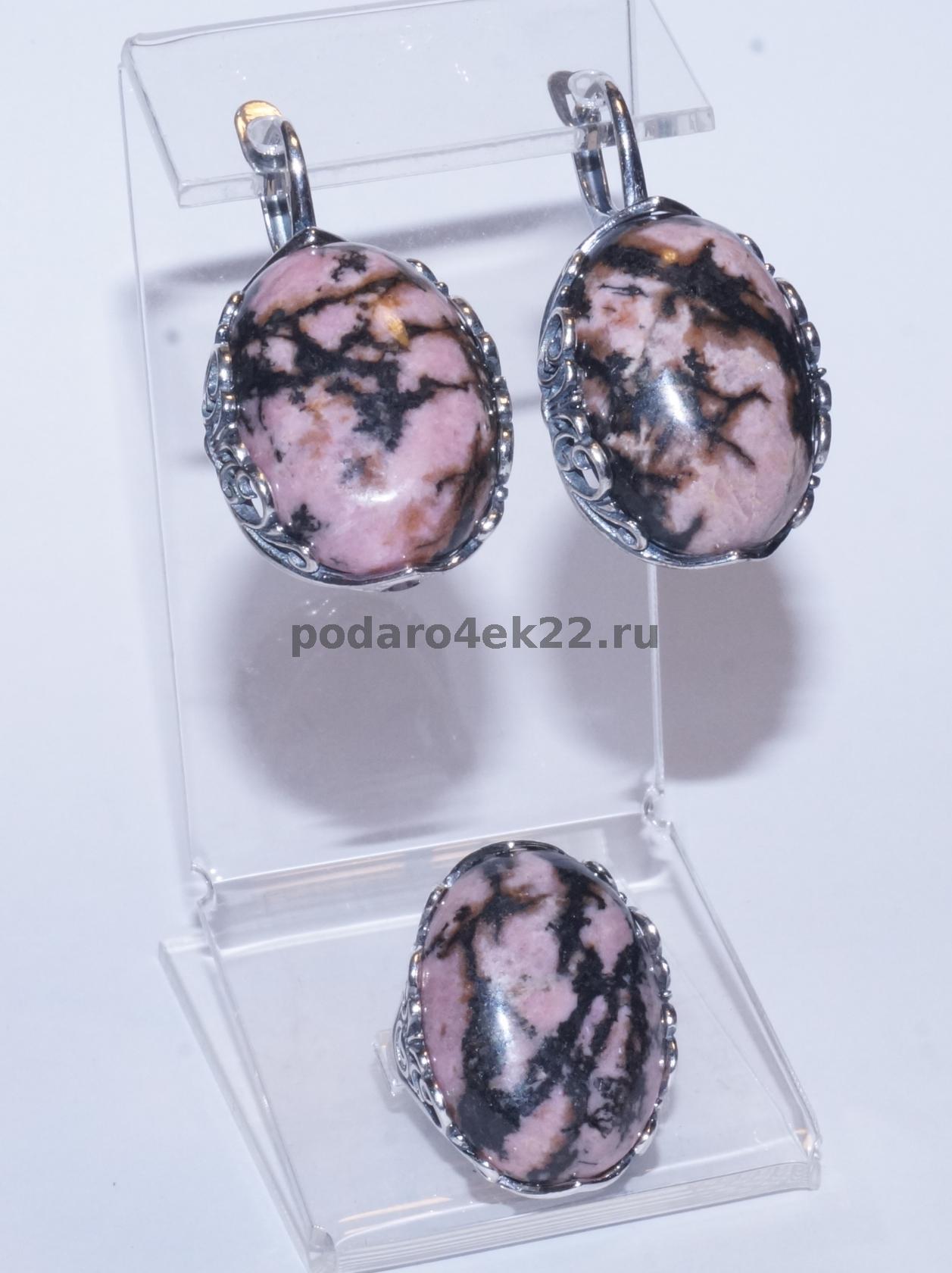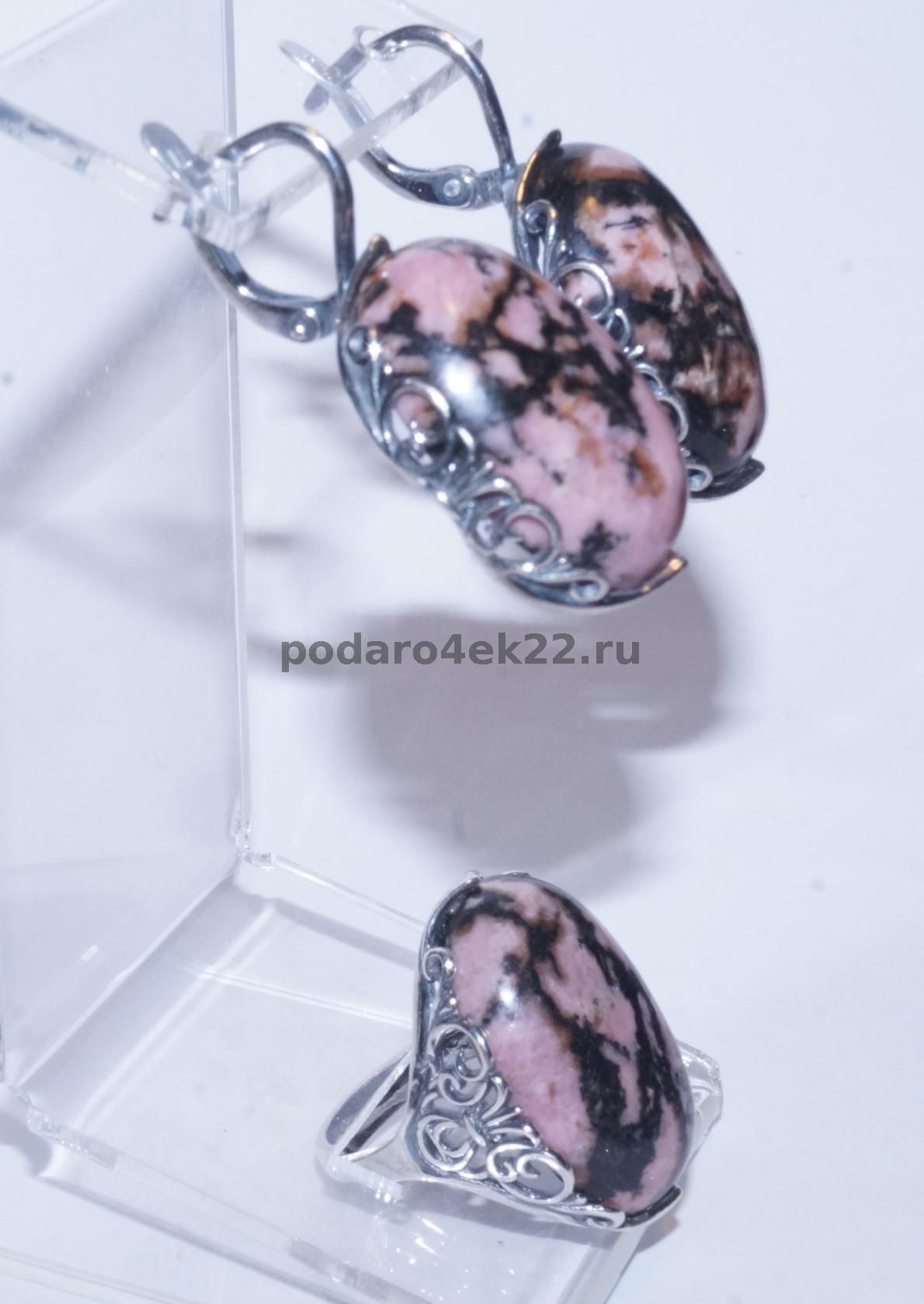 нк-0073. Серьги и кольцо с натуральным родонитом. 17 разм.