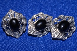 Комплект, серьги и кольцо с черным агатом. Размер кольца 18. Длина сережек 2,3 см. Камень 1 см. Гипоаллергенный сплав на основе серебра с родиевым покрытием. Проба 777. Производство Россия.
