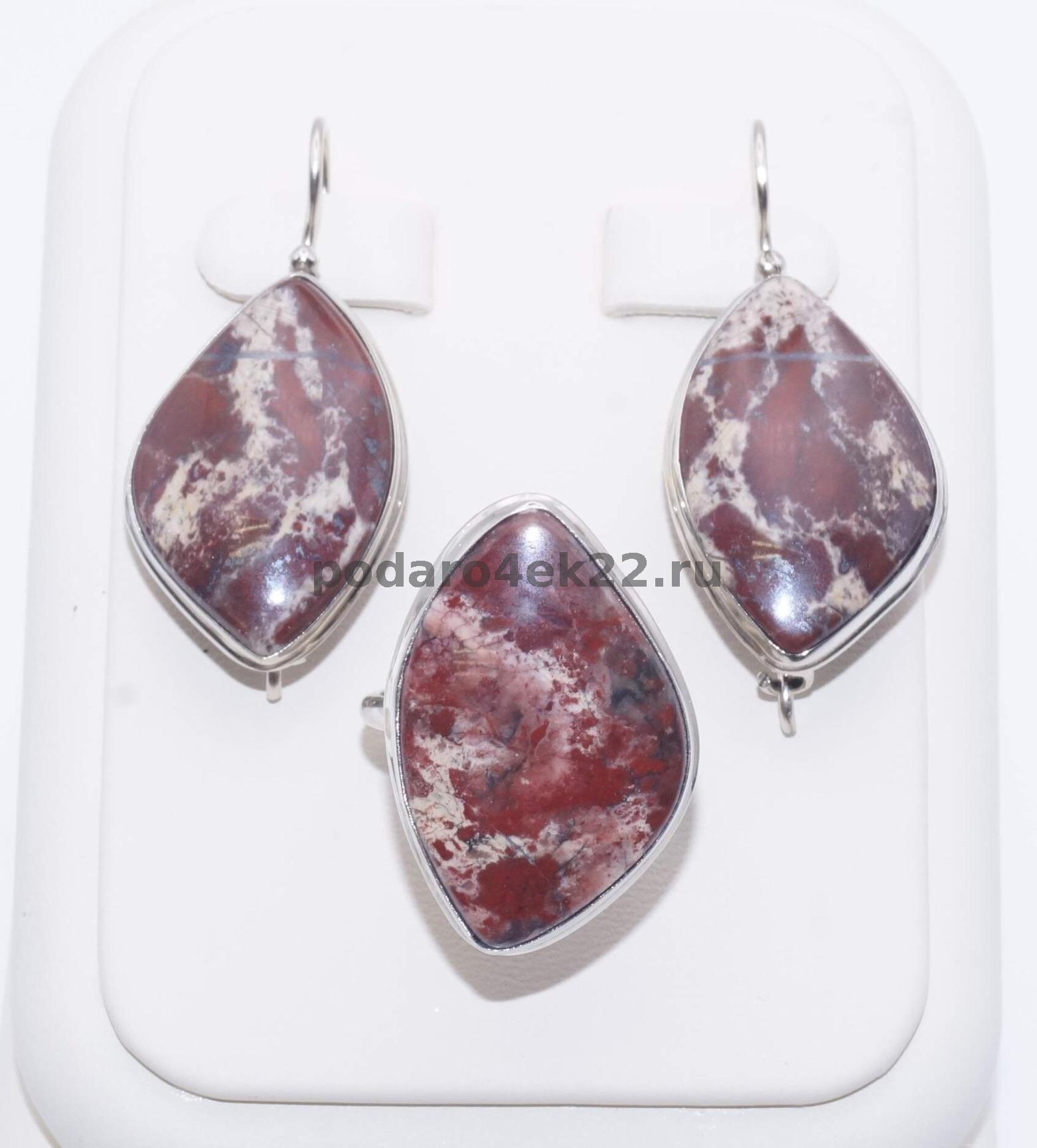 Комплект серьги и кольцо с натуральной красной яшмой. Размер кольца регулируется от 18,5 до 19,5, камень 3 х 2 см. Длина серёжек 4 см, камень 2,7 х 1,7 см. Гипоаллергенный сплав на основе серебра с родиевым покрытием. Проба отдела технического контроля (ОТК). Производство Россия, Урал.