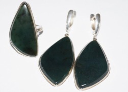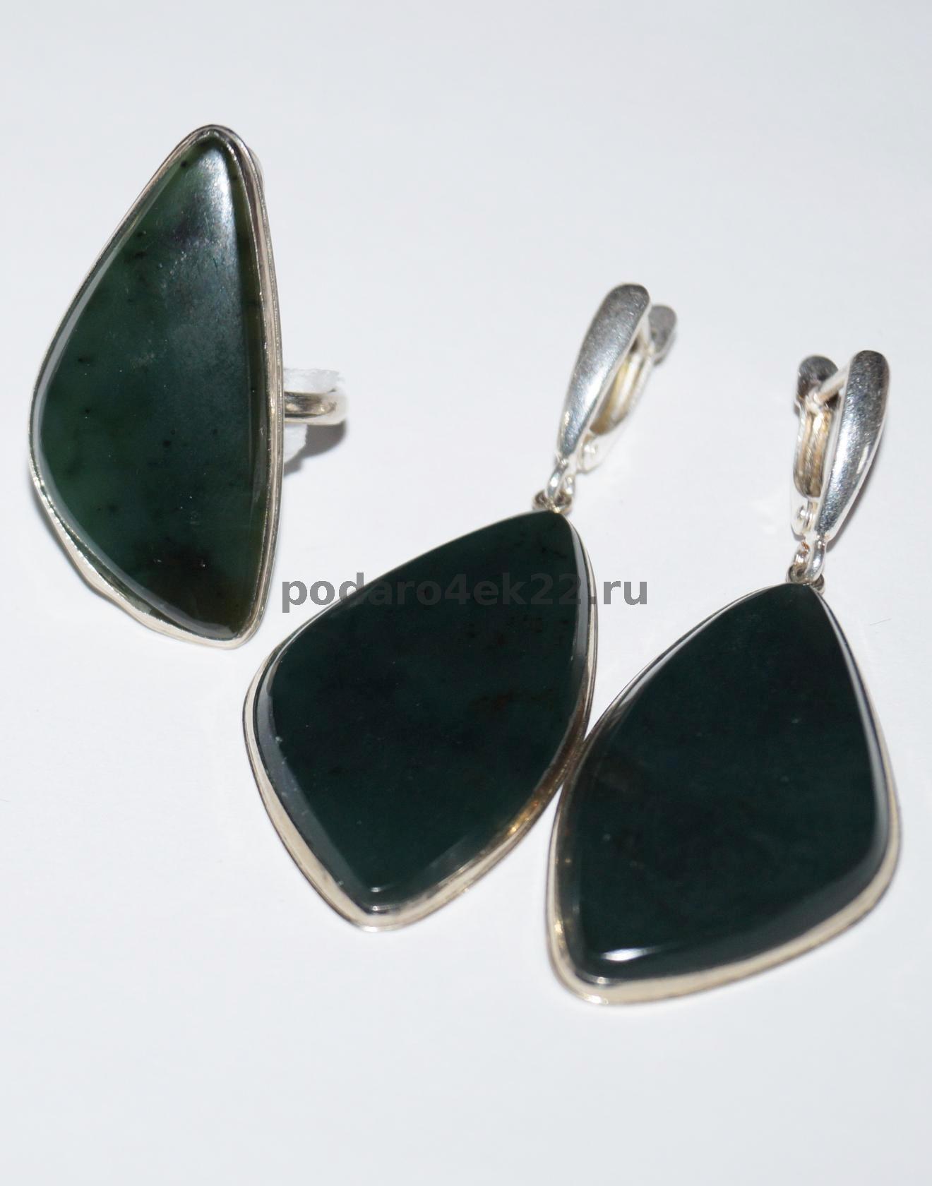 Крупный комплект "Грация" с натуральным темно-зеленым нефритом. Длина серёжек 5,5 см, камень 3,6 х 2 см, английский замочек. Размер кольца регулируется от 17 до 18,5, камень 3,4 х 1,7 см. Гипоаллергенный сплав на основе серебра, с родиевым покрытием. Проба отдела контроля качества (ОТК).