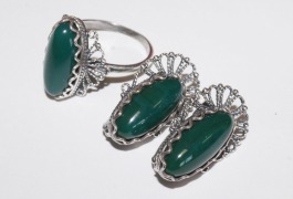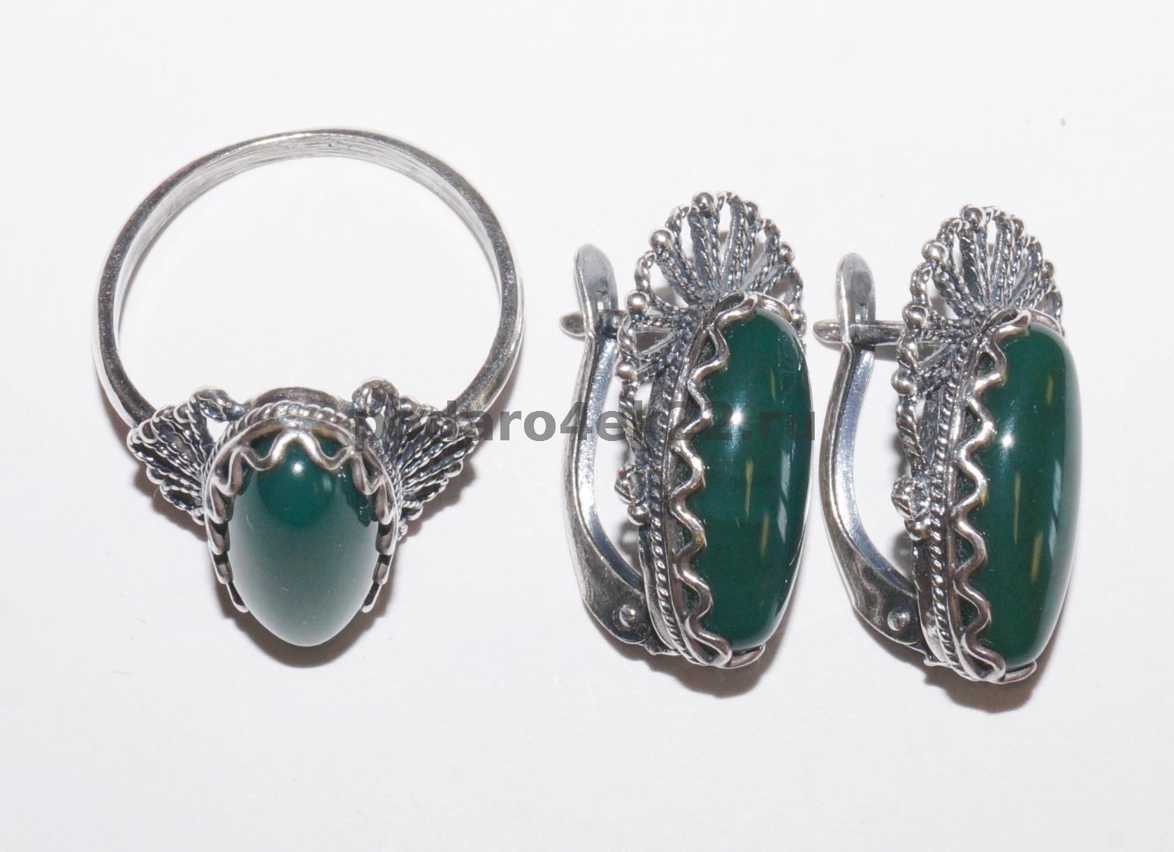 Серьги и перстень с натуральным прессованным хризопразом. Размер кольца 20. Длина сережек 2,4 см. Камень 1,8 см. Гипоаллергенный сплав на основе серебра, с родиевым покрытием. Проба отдела технического контроля (ОТК). Производство Россия.