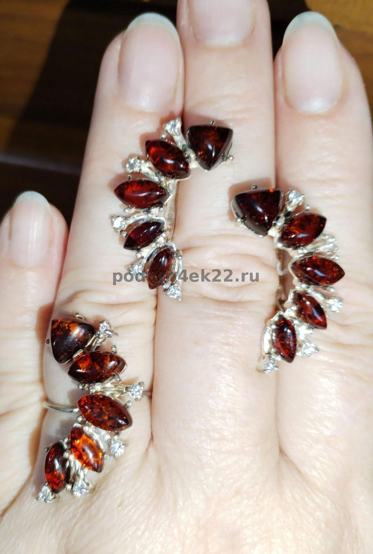 яс-043. Комплект "Полумесяц" с вишневым янтарем в серебре. 18,5 разм.