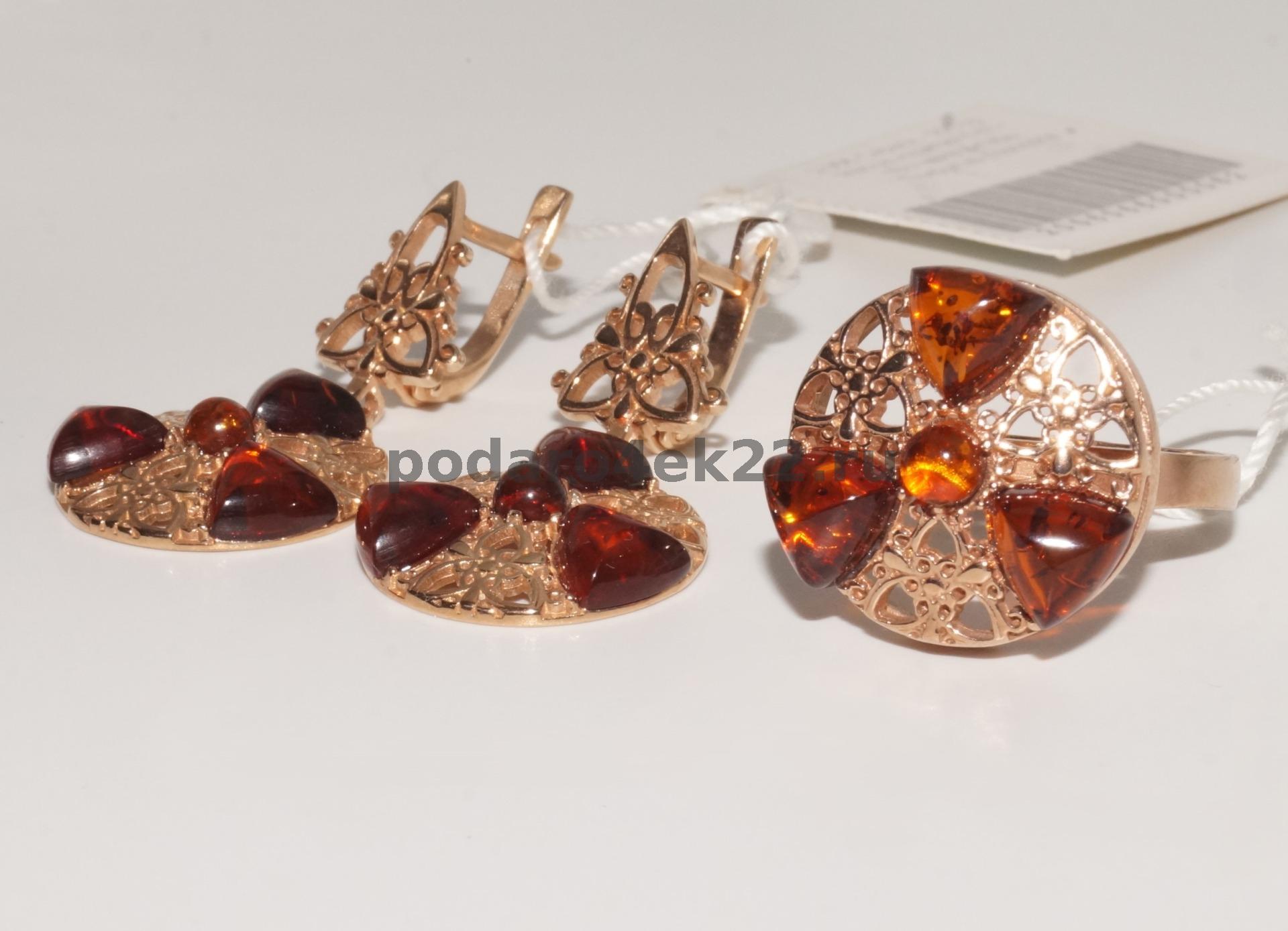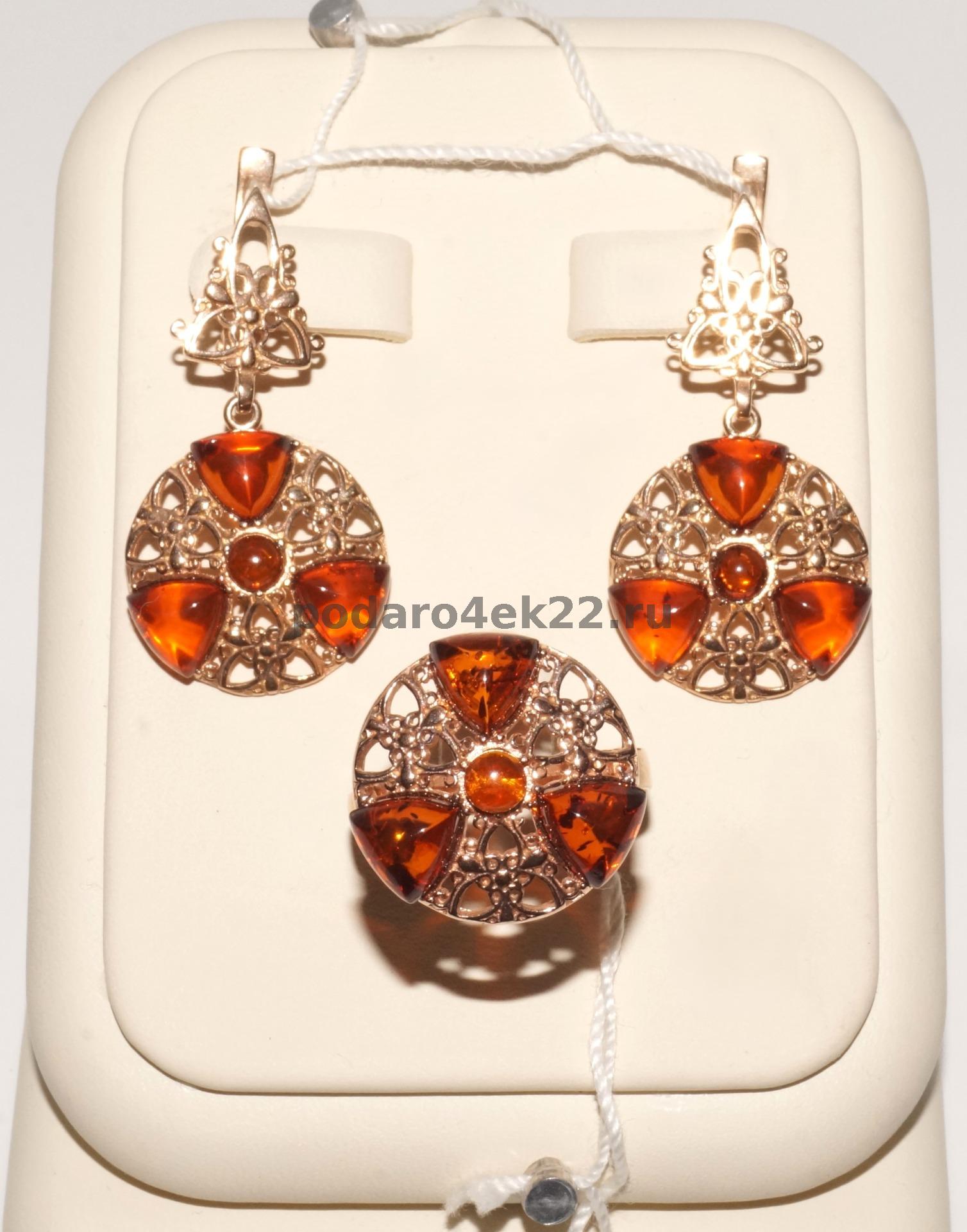 яс-057. Комплект "Азиатка» с коньячным янтарем в позолоте. 19 разм.