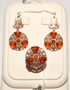 Комплект "Азиатка». Серьги и кольцо с коньячным янтарем и фианитами в позолоте (серебро 925 пробы покрытое золотом 585 пробы). Длина сережек 3,6 см. Камни 8 и 4 мм. Размер кольца 19. Вес 11,3 гр. Янтарь природный балтийский. По 2 пробы, бирки, пломбы. Производство Россия. Завод.