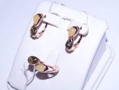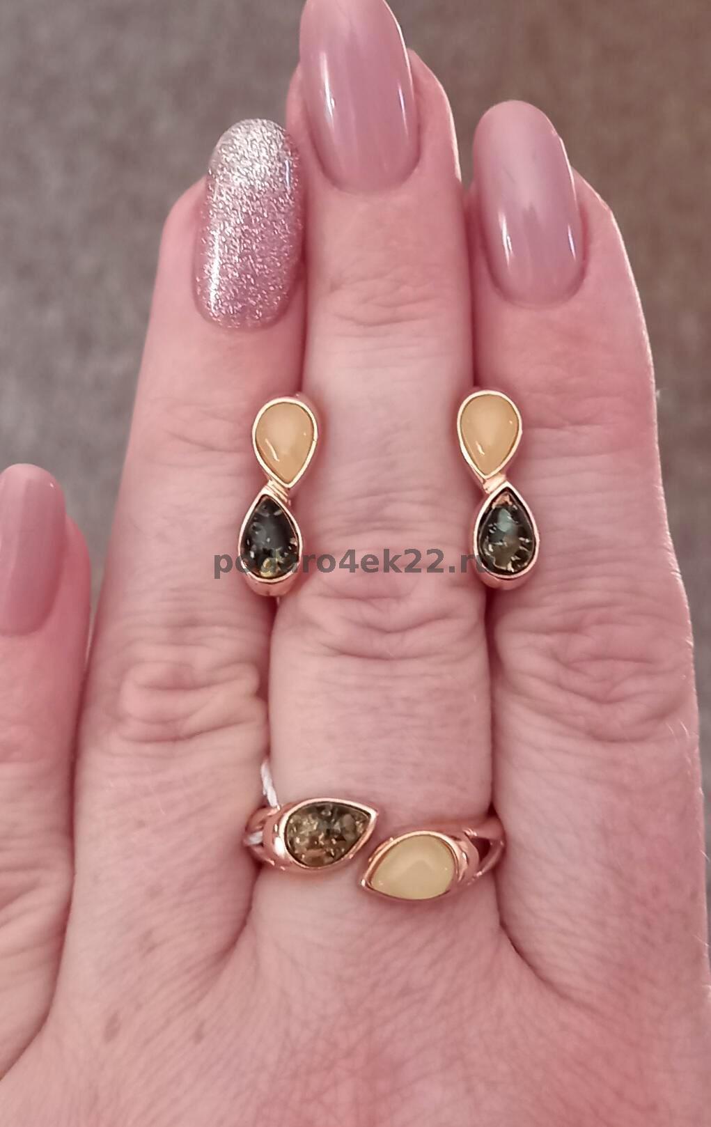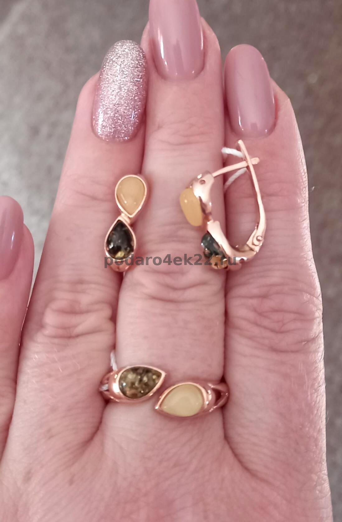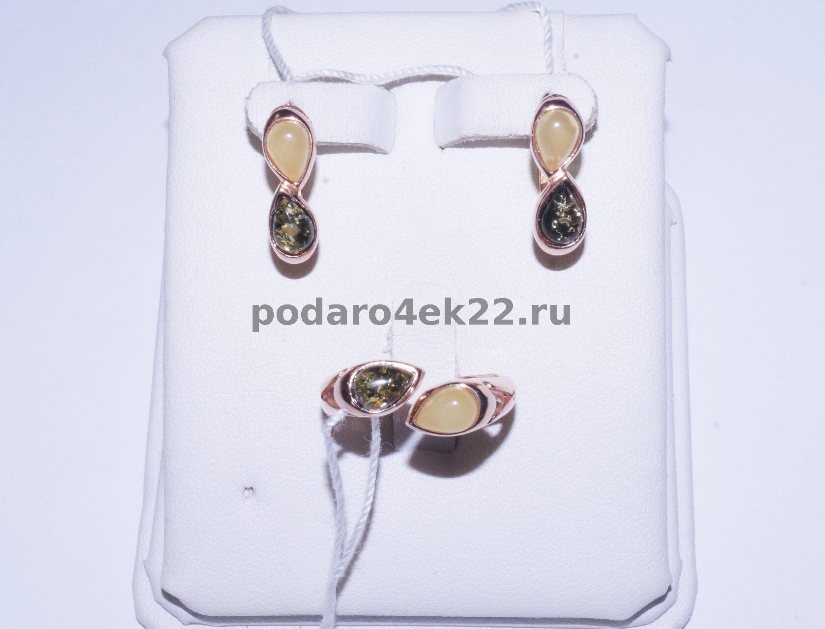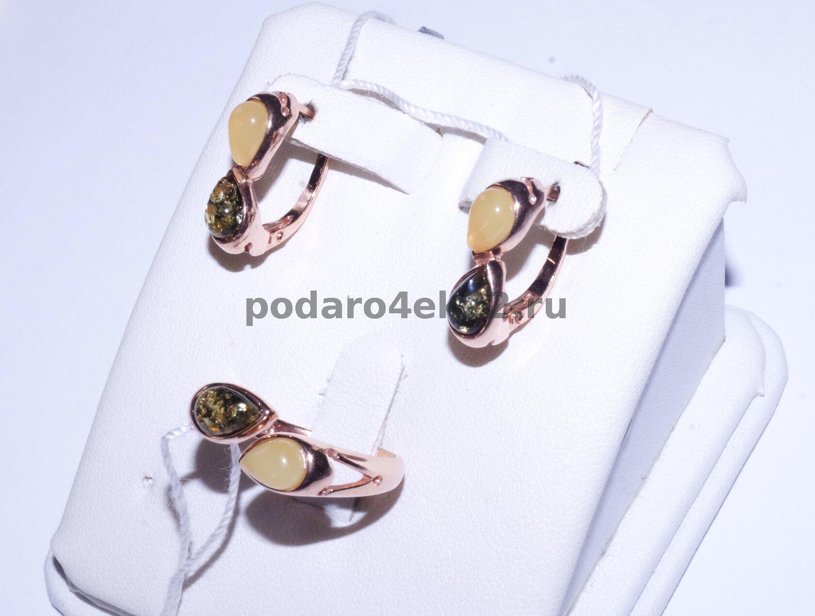яс-073. Серьги и кольцо с зеленым и королевским янтарем в позолоте. Безразм.