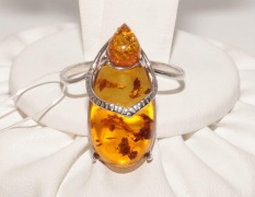 Кольцо "Скарабей" с медовым янтарем в серебре 925 пробы с родиевым покрытием. Вес 2,4 гр. Камни 1,8 х 1 см и 6 мм. Размер кольца 19. Янтарь природный балтийский. Производство Россия. Завод. 2 пробы, бирка, пломба.