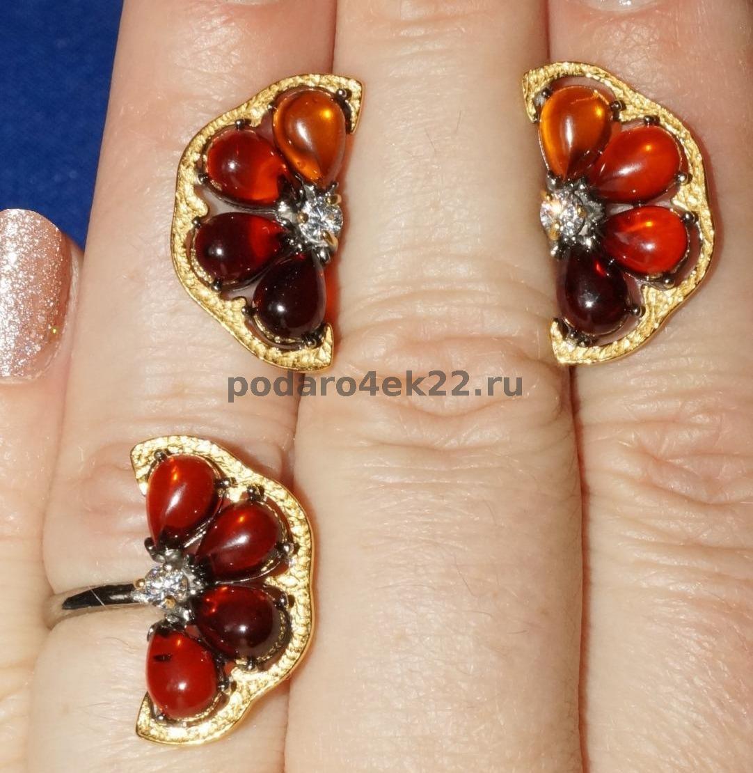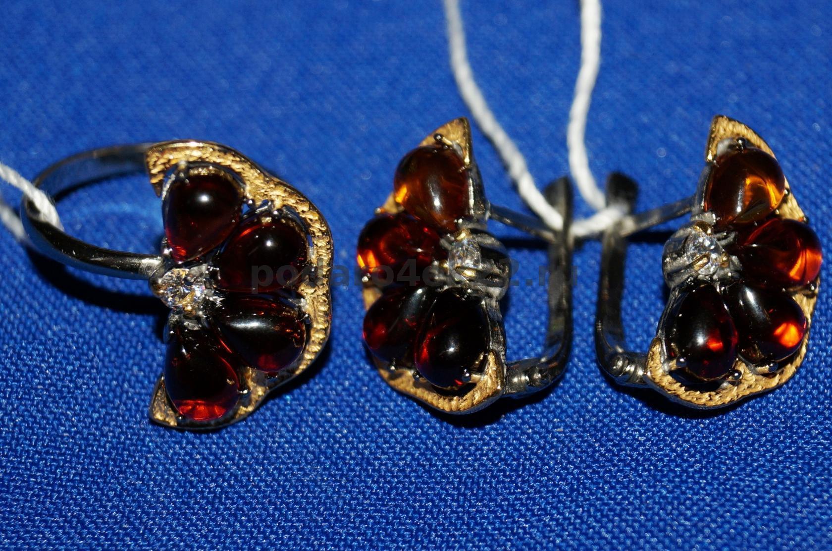 Комплект "Дольки грейпфрута". Перстень и серьги с натуральным коньячно-вишнёвым янтарем в чернении и позолоте (серебро 925 пробы, покрытом черным родием и золотом 585 пробы). Кольцо 17 размера. Длина сережек 2,2 см. Янтарь 0,7 см. Вес 8,3 гр. Янтарь природный балтийский. По 2 пробы, пломбы, бирки. Производство Россия. Завод.