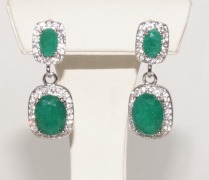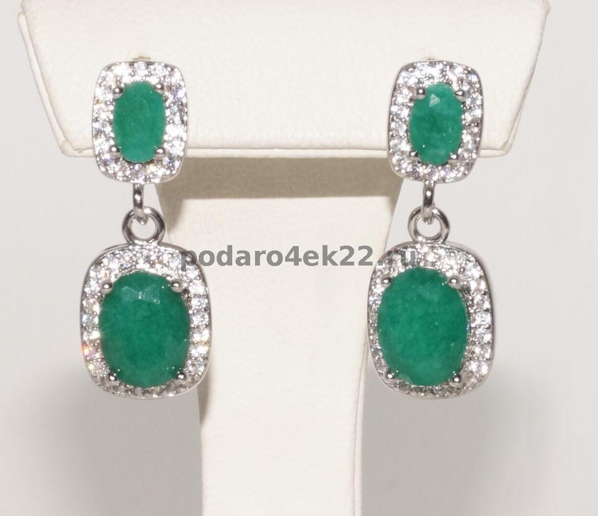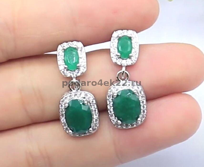 Серьги-гвоздики с натуральными изумрудами и фианитами. Длина серёжек 2,6 см. Камни 6 и 9 мм. Посеребрение (практически одно серебро) с родиевым покрытием, проба 925. Индия.