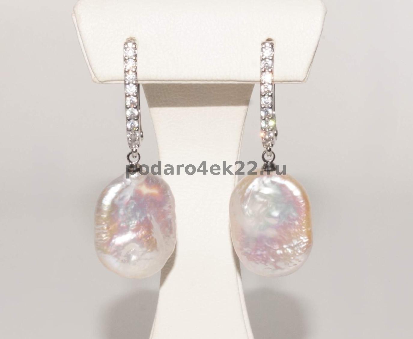 Серьги с натуральным жемчугом Барокко и фианитами. Посеребрение (практически одно серебро) с родиевым покрытием, проба 925 . Длина серёжек 4 см. Камень 1,8 х 1,4 cм. Индия. Хорошее качество.