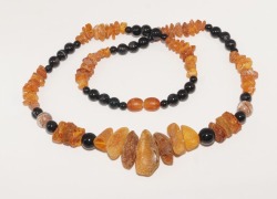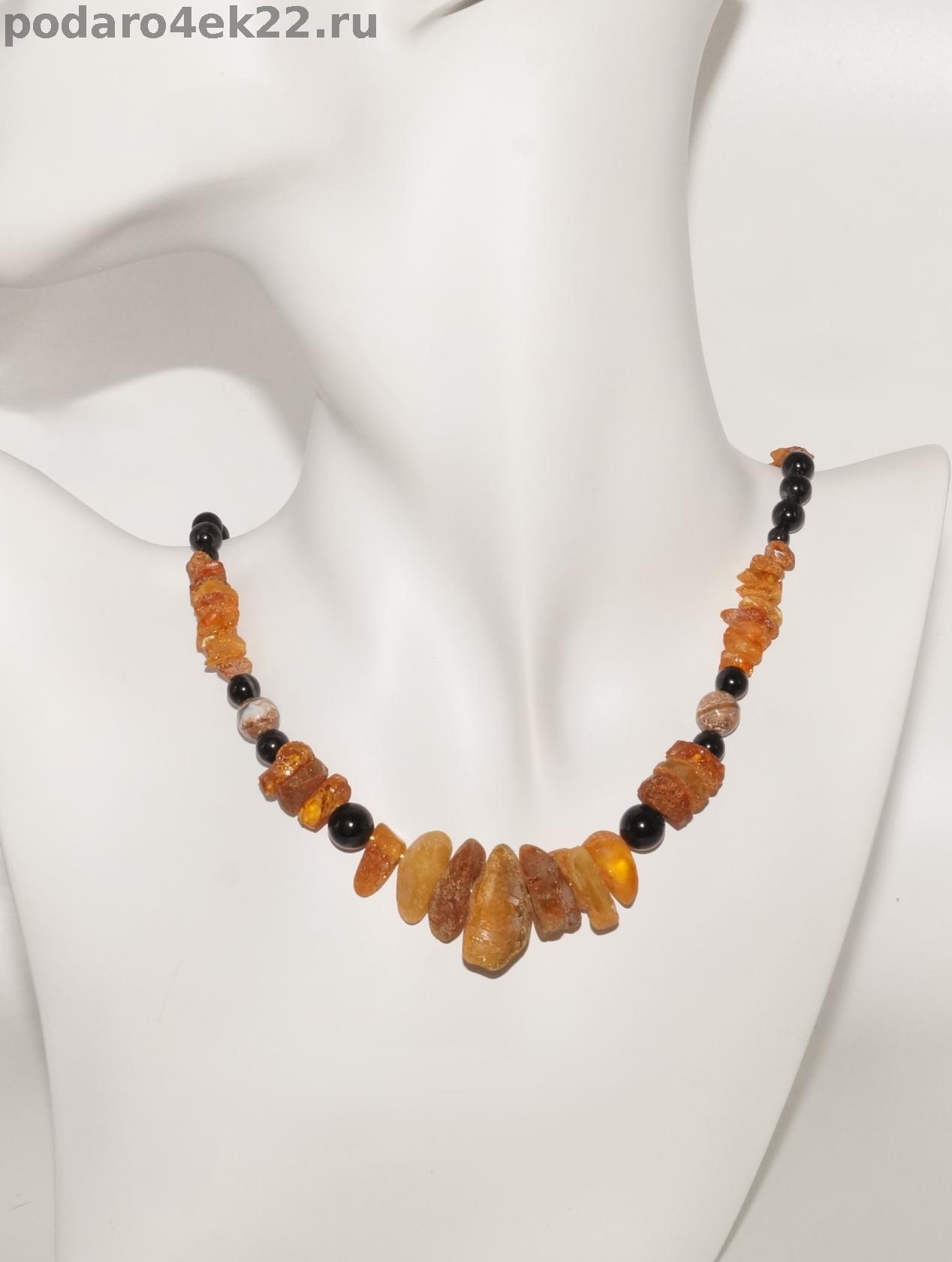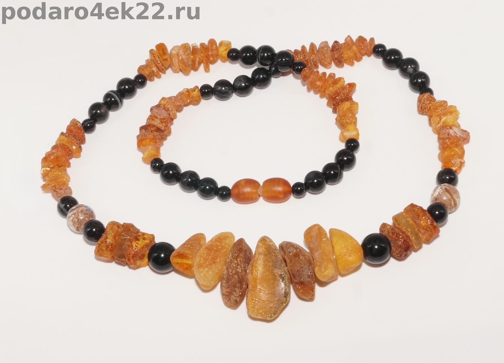 л-031-2. Бусы-оберег из лечебного янтаря, черного и тибетского агата. 47 см.