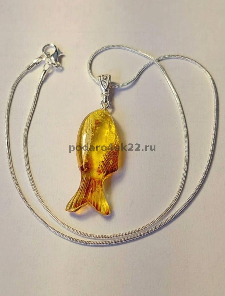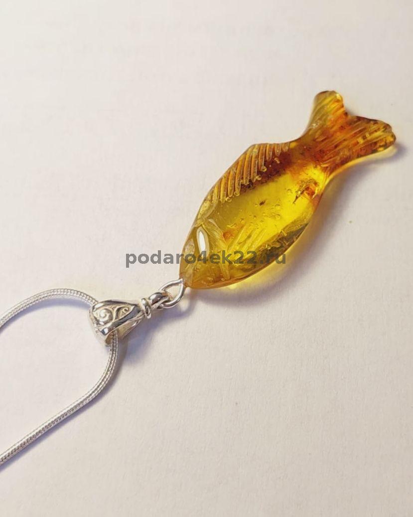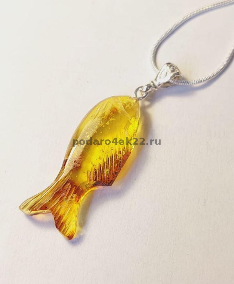Кулон резная рыбка из натурального янтаря с инклюзами (насекомое, мох и кора, возраст которых около 40 млн.лет). Длина кулона 5,2 см. Размер камня 3,8 х 1,5 см. Единственный и неповторимый экземпляр!