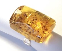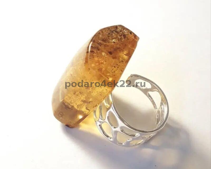 Кольцо с прямоугольным натуральным янтарем с включениями (мох и кора, возраст которых около 40 млн.лет). Размер камня 3 х 2 см, толщина 8 мм. Размер кольца регулируется. Янтарь природный балтийский. В янтаре имеются природные корочки, ямочки, неровности, слои и включения, что подчёркивает подлинность янтаря и его природные особенности. Сейчас очень модно носить такие украшения.