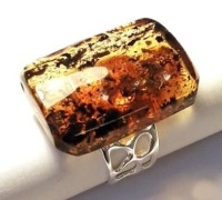 Крупное кольцо с прямоугольным натуральным янтарем с включениями (мох и кора, возраст которых около 40 млн.лет). Размер камня 3 х 2,2 см, толщина 8 мм. Размер кольца регулируется. Янтарь природный балтийский. В янтаре имеются природные ямочки, неровности, слои и включения, что подчёркивает подлинность янтаря и его природные особенности. Сейчас очень модно носить такие украшения.