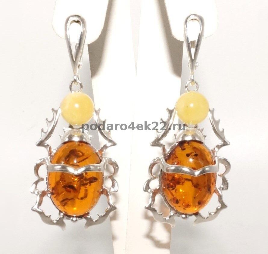п-0028. Серьги "Скарабеи" с медовым и королевским янтарем в серебре.