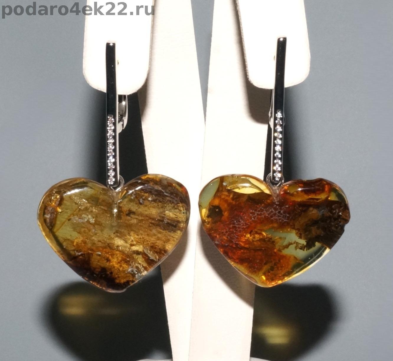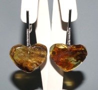 п-0032. Серьги Сердечки из янтаря с включениями.