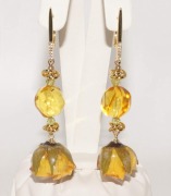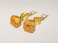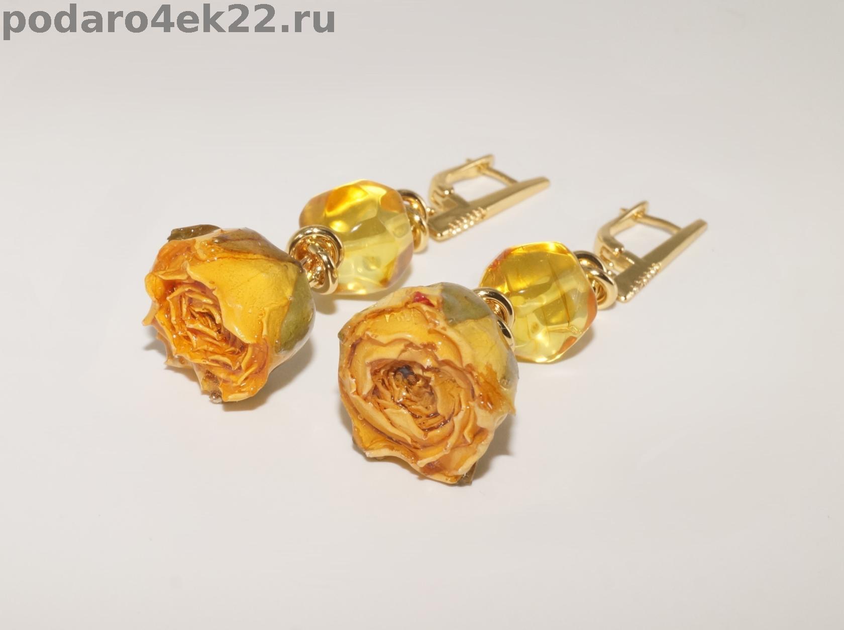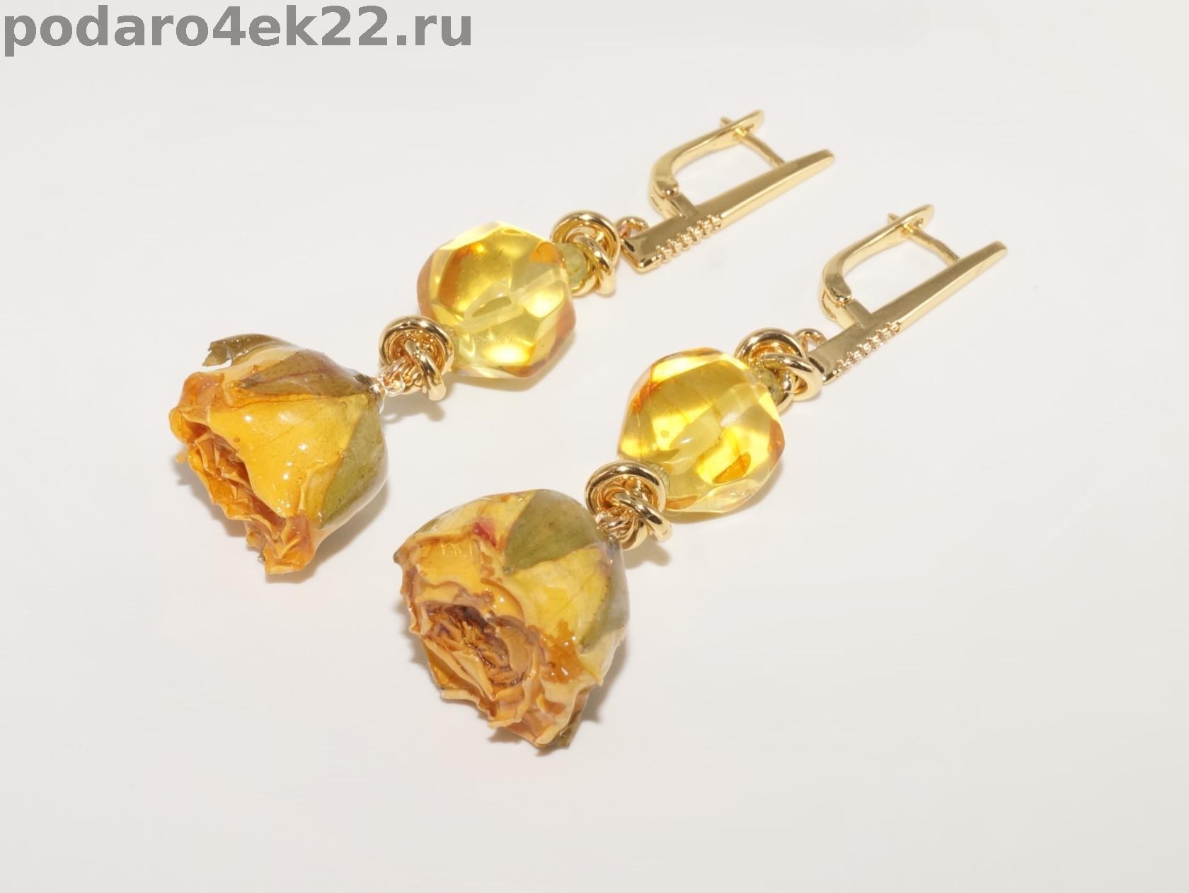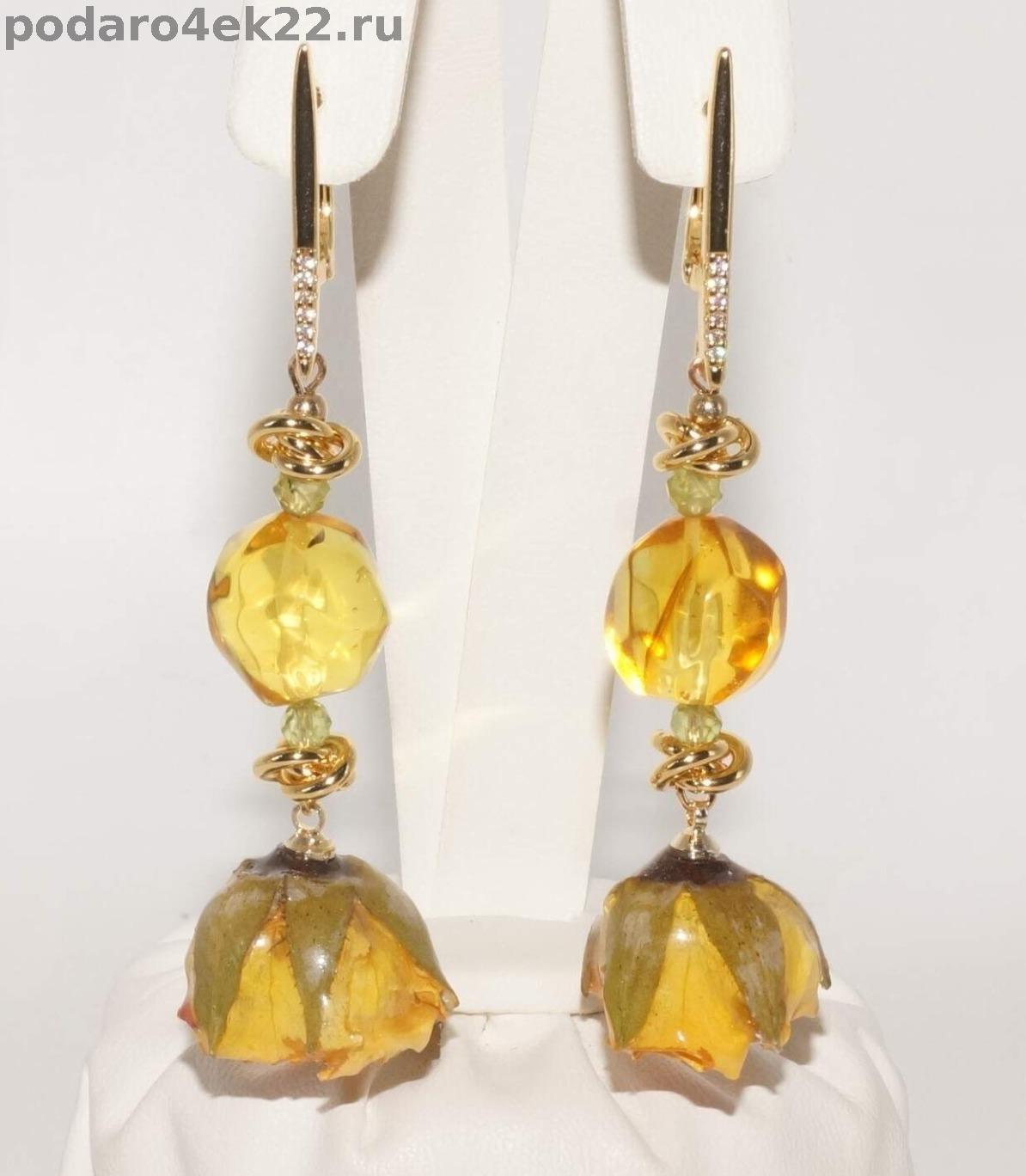 п-0081. Длинные серьги "Розы с янтарем, хризолитами и натуральными розами в смоле.