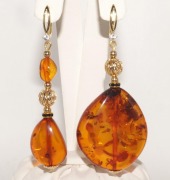 п-0087. Длинные крупные ассиметричные серьги с коньячным янтарем.