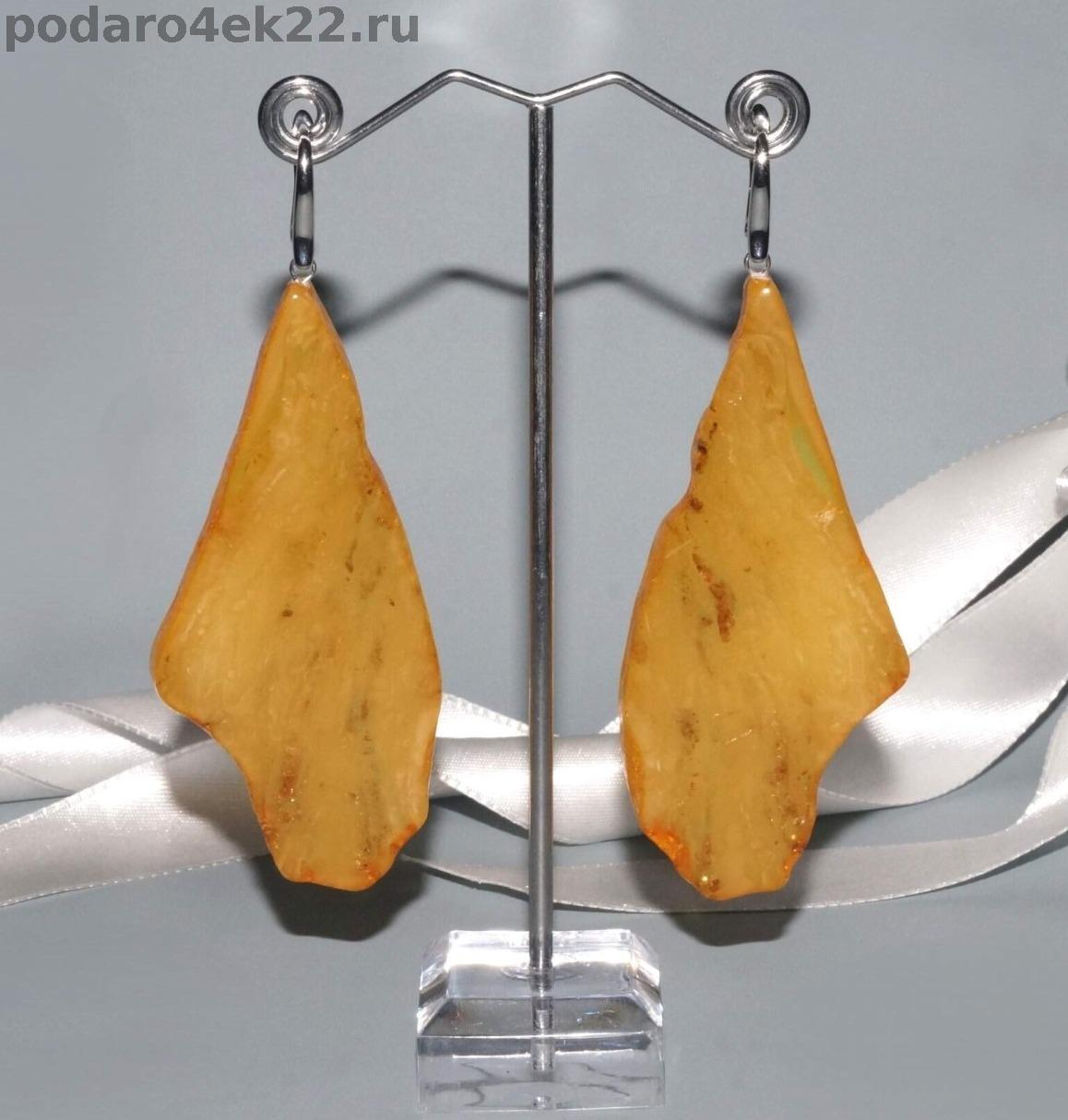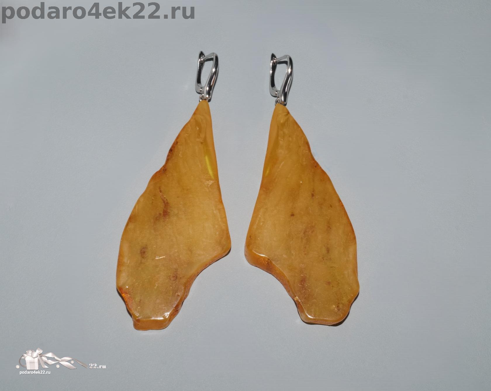 Очень крупные длинные серьги из срезов натурального матового пейзажного янтаря природной формы с включениями. Серьги длиной 9,7 см. Камни 7,6 х 3,5 см. Спилы одного камня. По бокам сохранена природная корочка. Янтарь природный балтийский. Вес камней 27 гр. Фурнитура родированная. Авторская ручная работа.
