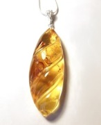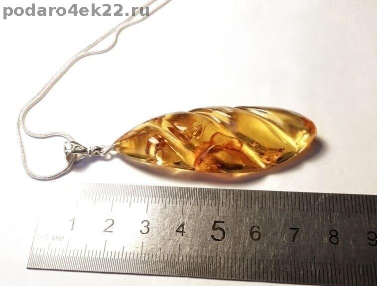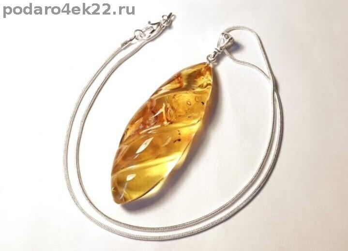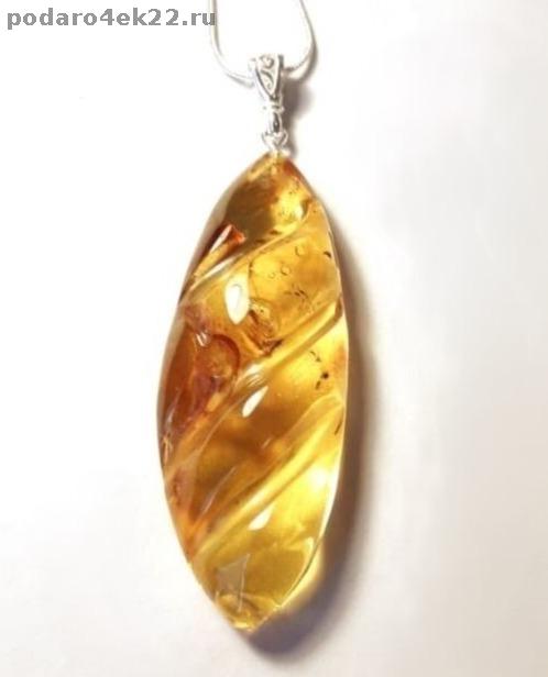Крупный резной кулон из натурального янтаря с включениями (кора и мох, возраст которых около 40 млн.лет) и природными ямочками. Длина кулона 7,4 см. Размер камня 6 х 2,2 см, толщина 1 см. Янтарь природный балтийский. Единственный экземпляр.