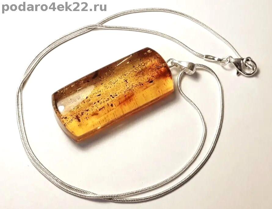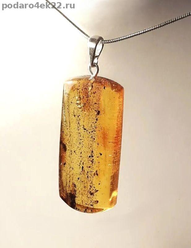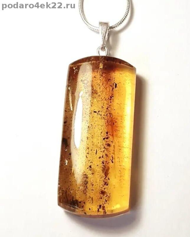 Крупный кулон из натурального янтаря с включениями (кора и мох, возраст которых около 40 млн.лет.) Длина 5,6 см. Размер камня 4,4 х 1,9 см, толщина 9 мм. Янтарь природный балтийский. Фурнитура и цепь посеребрение 925 пробы.