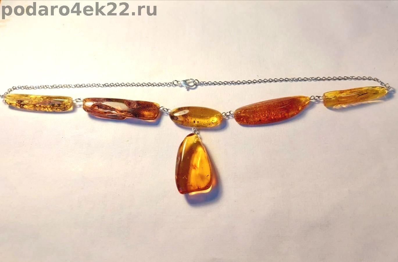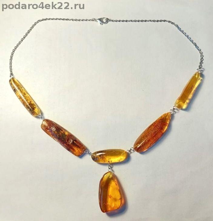 Колье с кулоном из натурального янтаря с включениями (мох и кора, возраст которых около 40 млн.лет). Длину колье подгоню под хозяйку от 38 см до 51 см. Янтарь природный балтийский. Длина камней от 3,4 до 4,8 см. В янтаре имеются природные корочки, ямочки, неровности и включения, что подчёркивает подлинность янтаря и его природные особенности. Сейчас очень модно носить такие украшения.